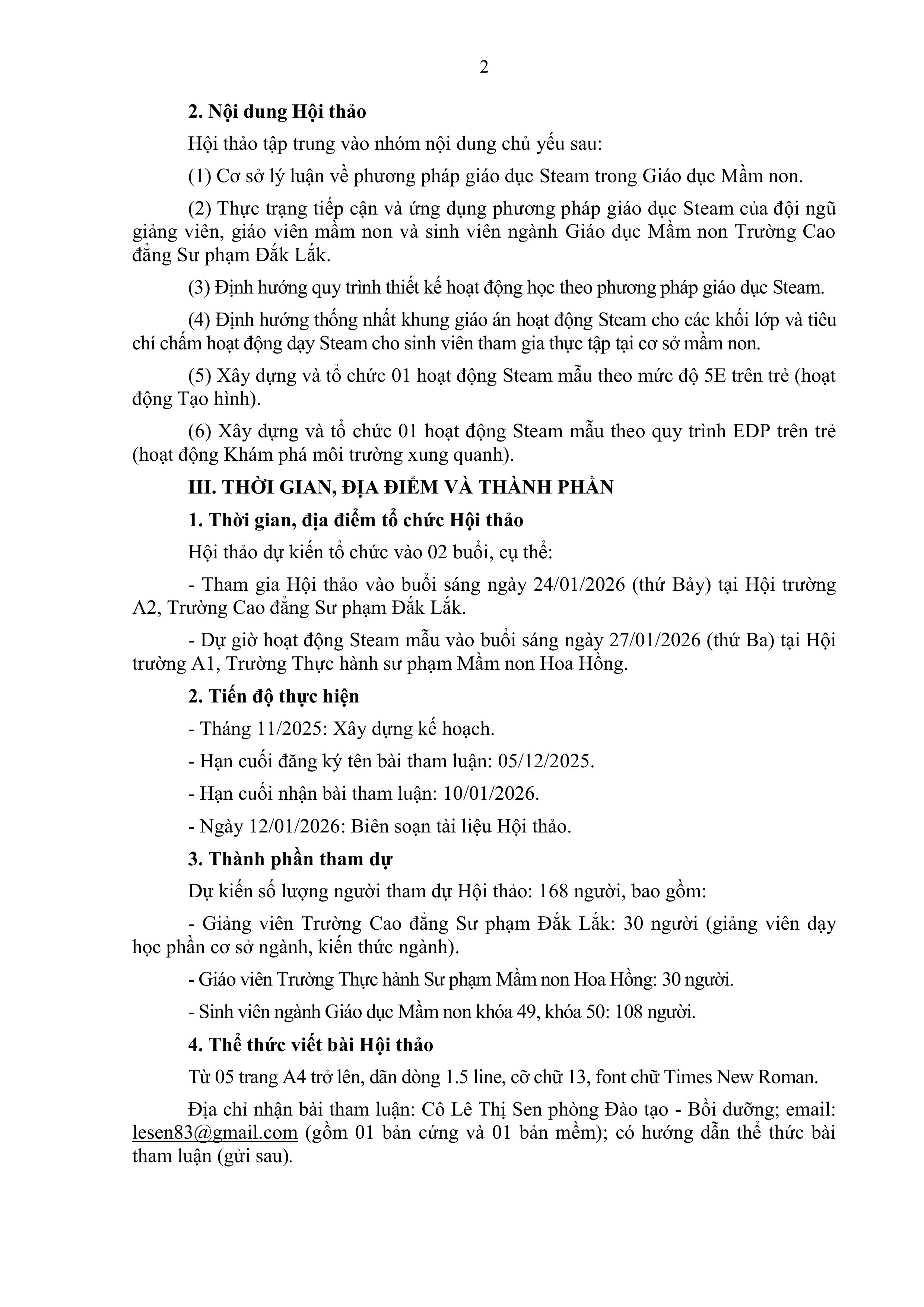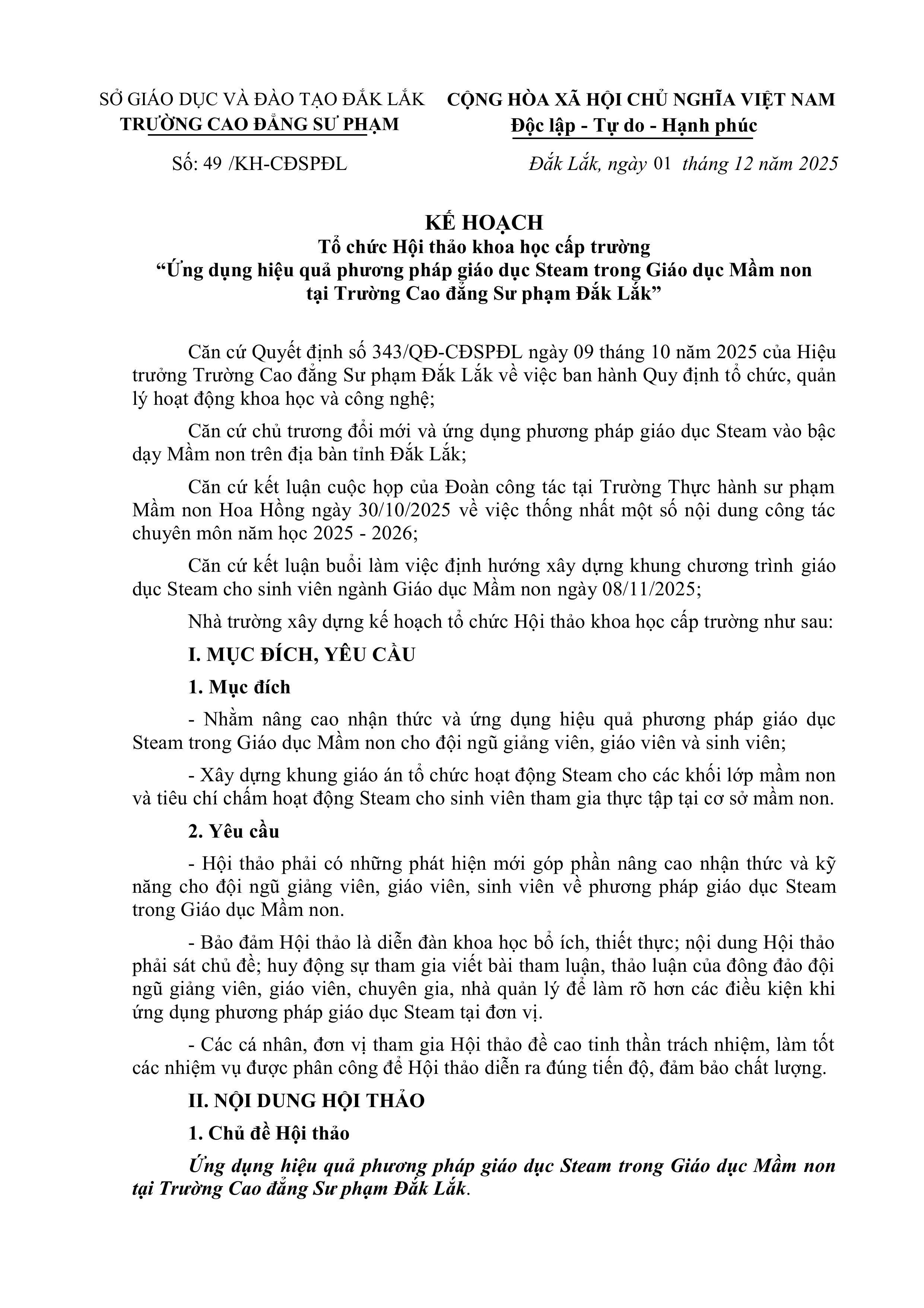 Kế hoạch tổ chức Hội thảo khoa học cấp trường ứng dụng hiệu quả phương pháp Giáo dục STEAM trong Giáo dục Mầm non tại trường Cao đẳng Sư phạm Đắk Lắk
