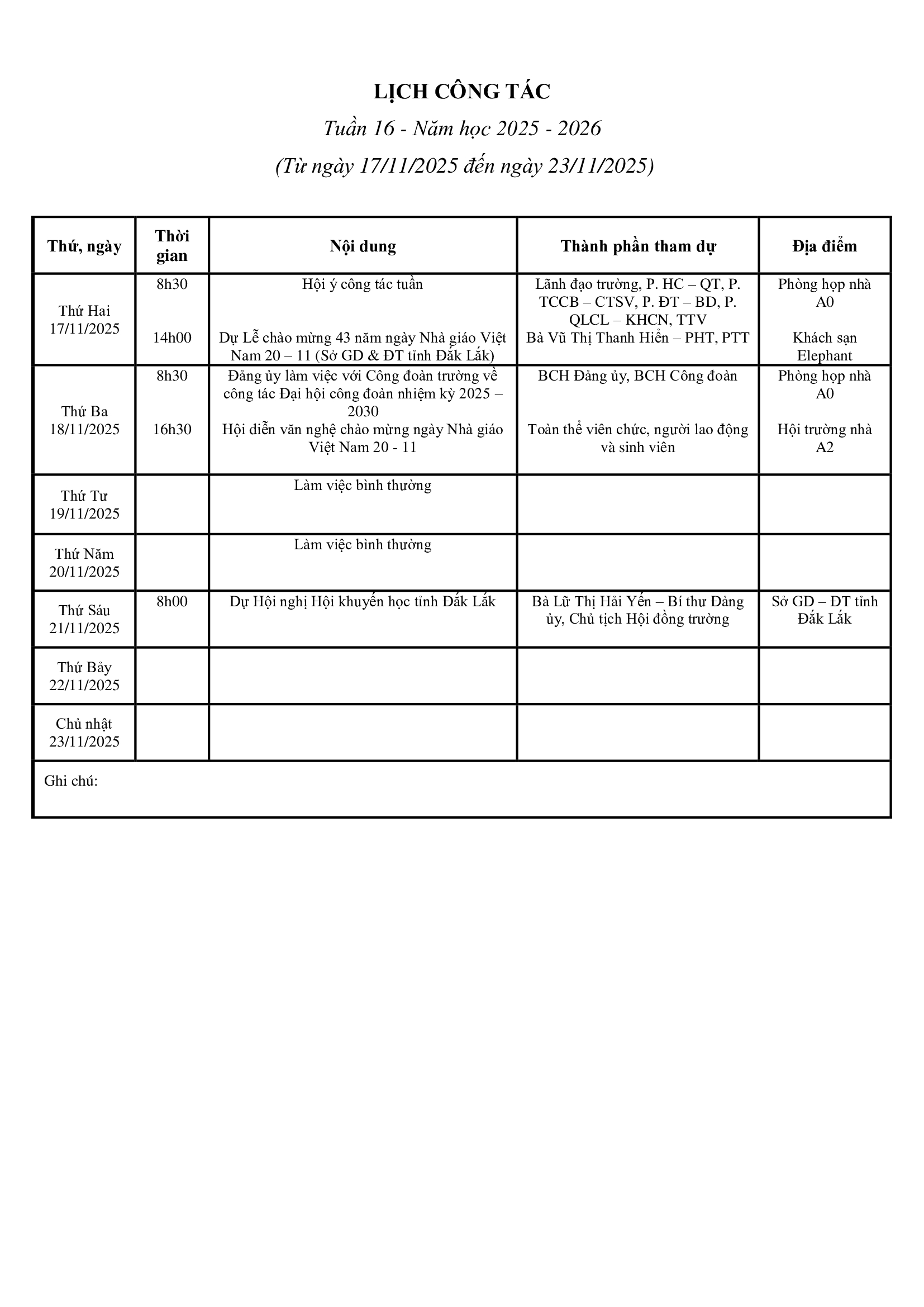 Lịch công tác tuần 16 (áp dụng từ ngày 17/11/2025 đến ngày 23/11/2025)