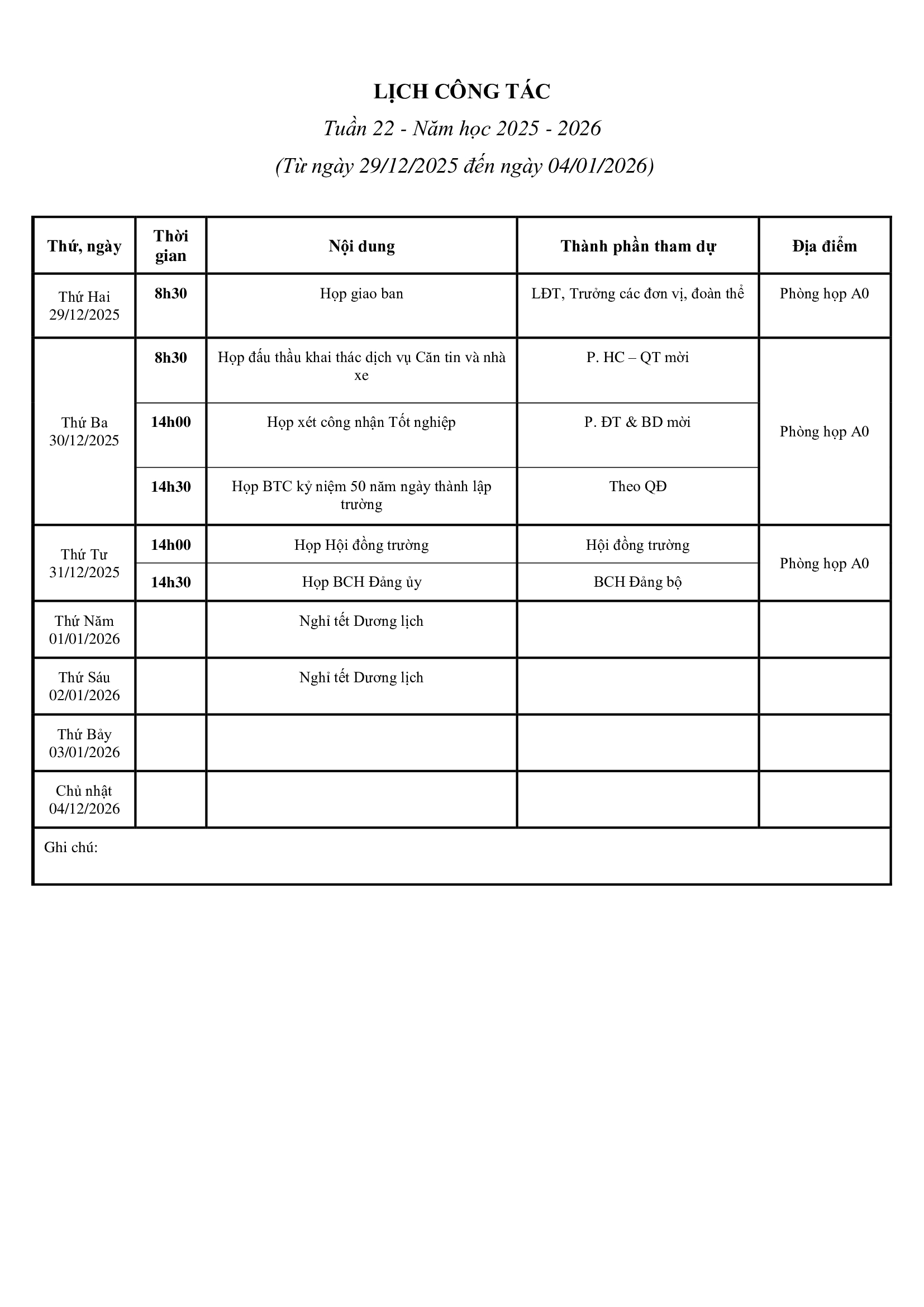 Lịch công tác tuần 22 (áp dụng từ ngày 29/12/2025 đến ngày 04/01/2026)