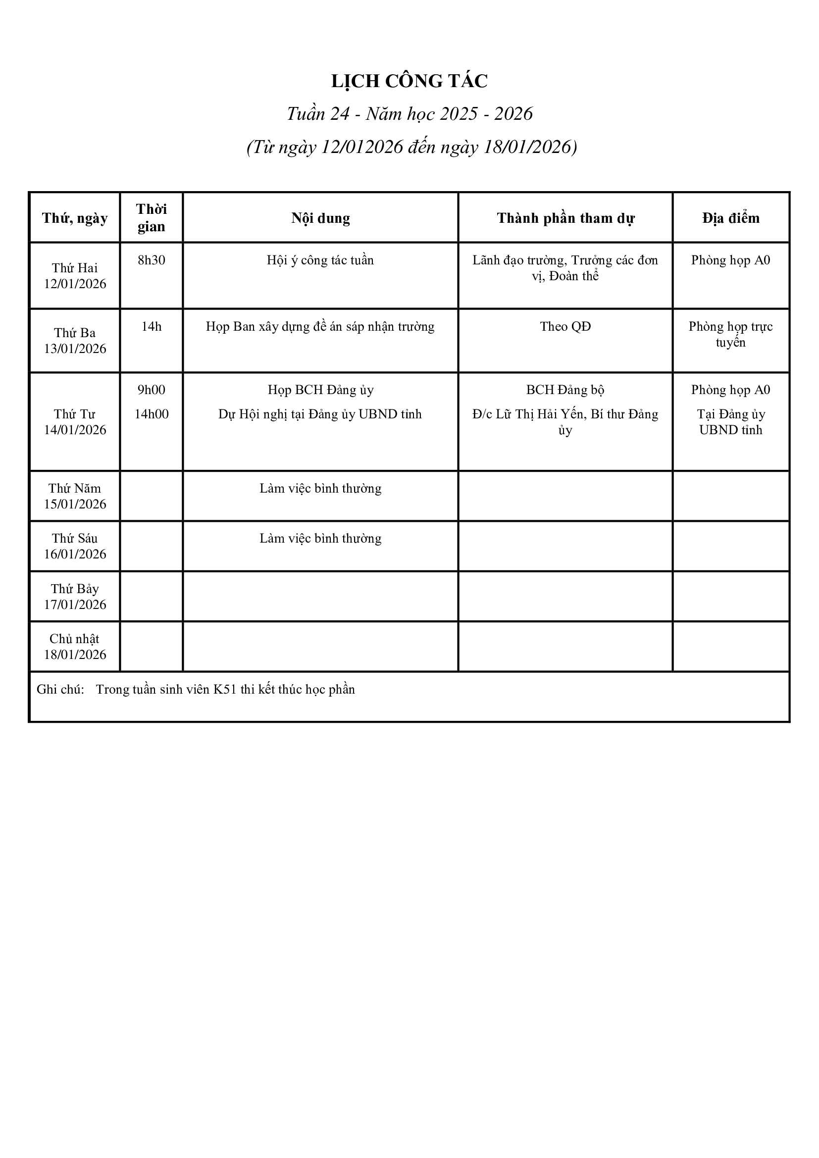 Lịch công tác tuần 24 (áp dụng từ ngày 12/01/2026 đến ngày 18/01/2026)