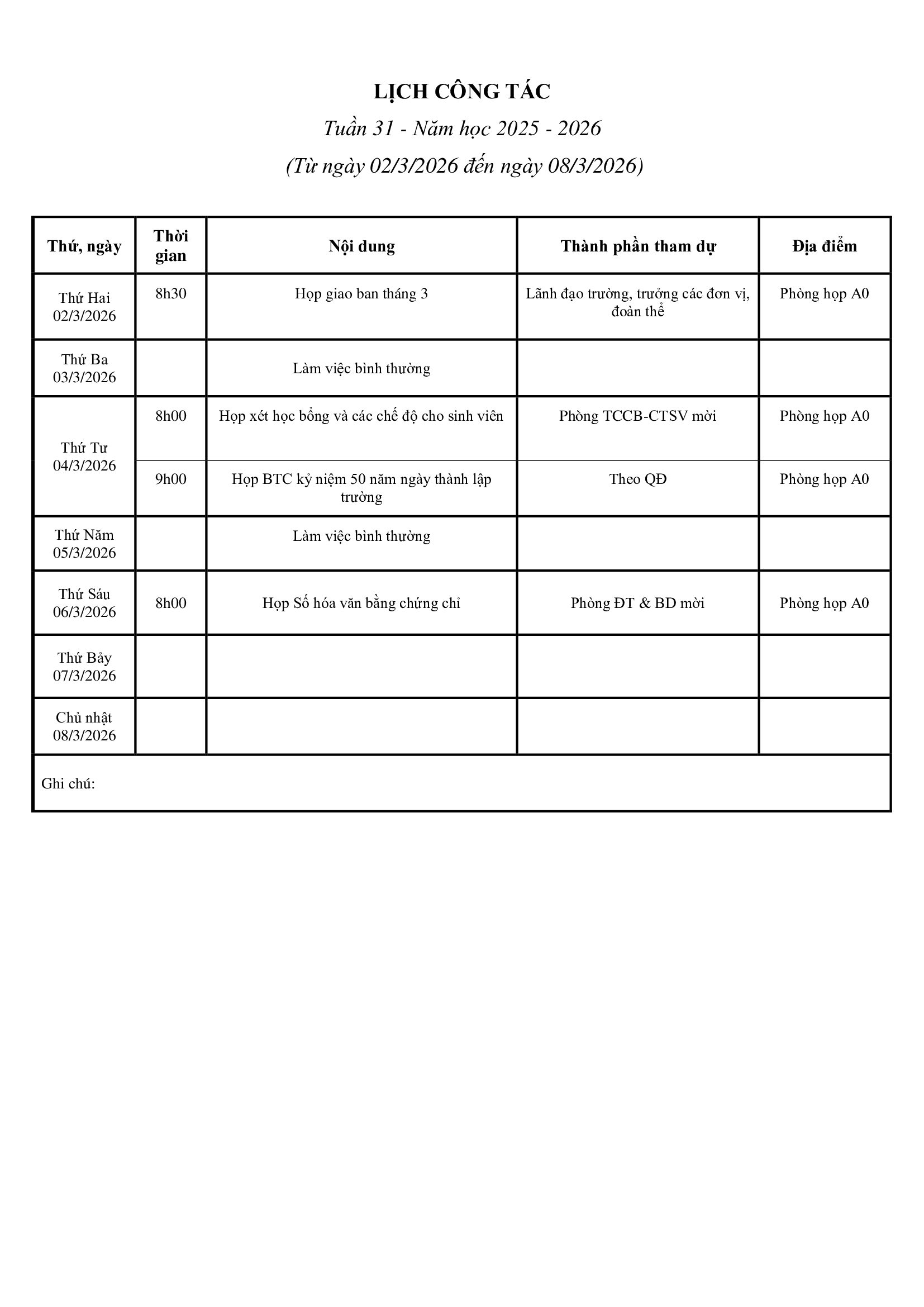 Lịch công tác tuần 31 (áp dụng từ ngày 02/3/2026 đến ngày 08/3/2026)