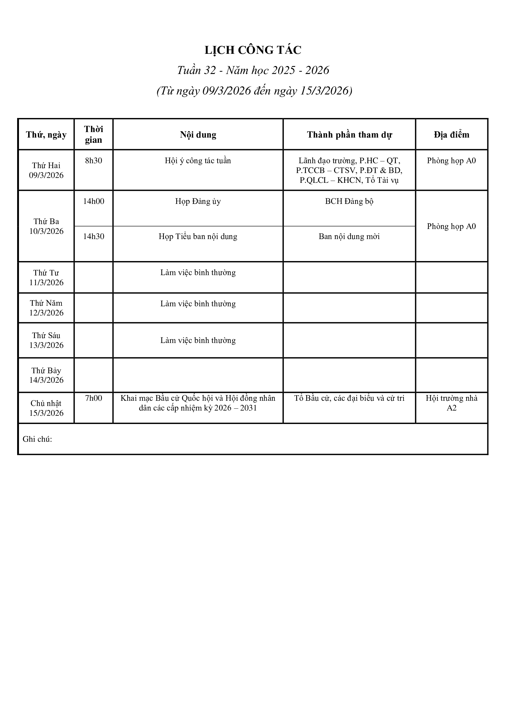 Lịch công tác tuần 32 (áp dụng từ ngày 09/3/2026 đến ngày 15/3/2026)