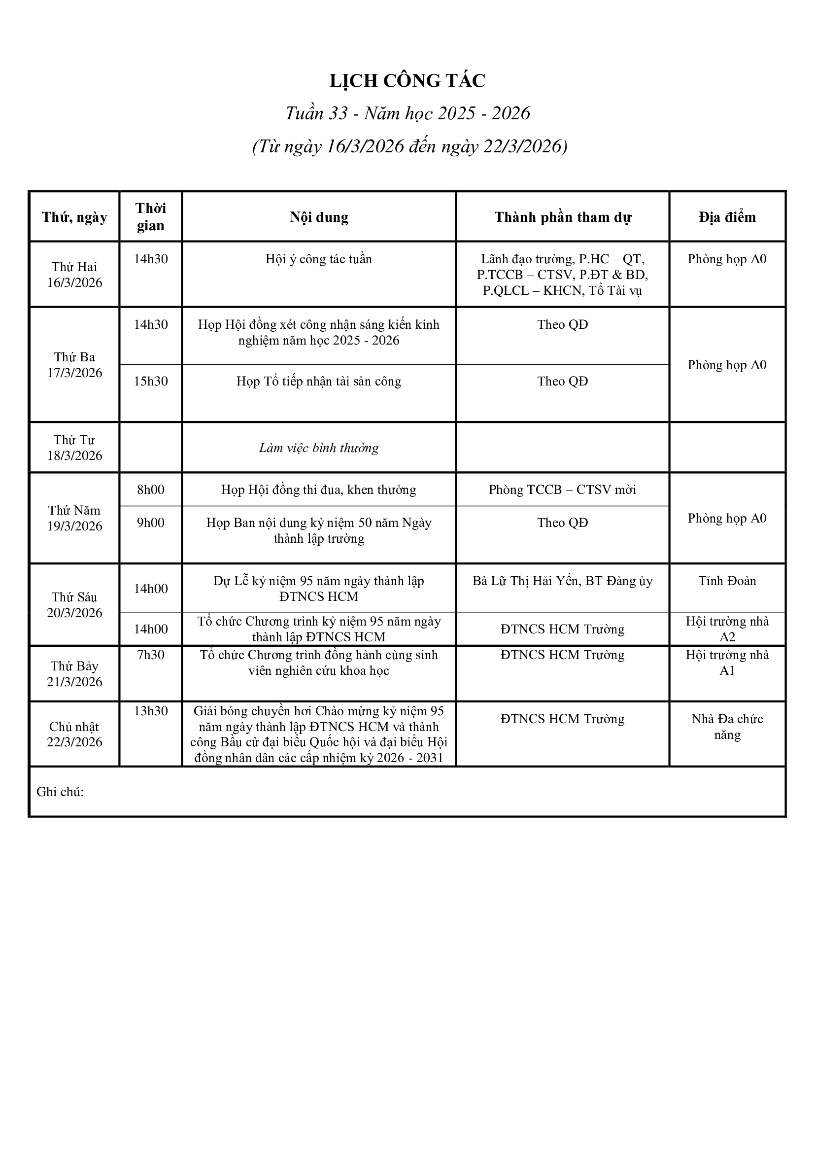 Lịch công tác tuần 33 (áp dụng từ ngày 16/3/2026 đến ngày 22/3/2026)