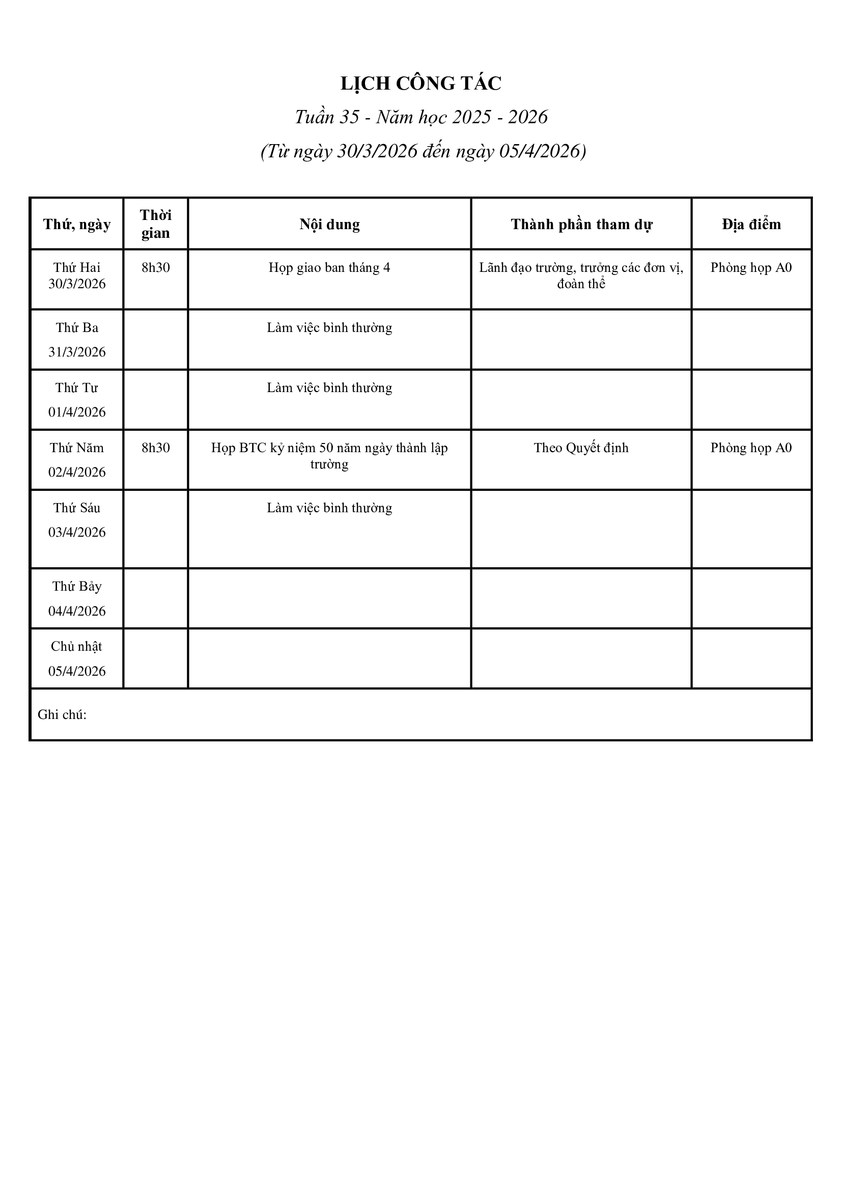Lịch công tác tuần 35 (áp dụng từ ngày 30/3/2026 đến ngày 05/4/2026)