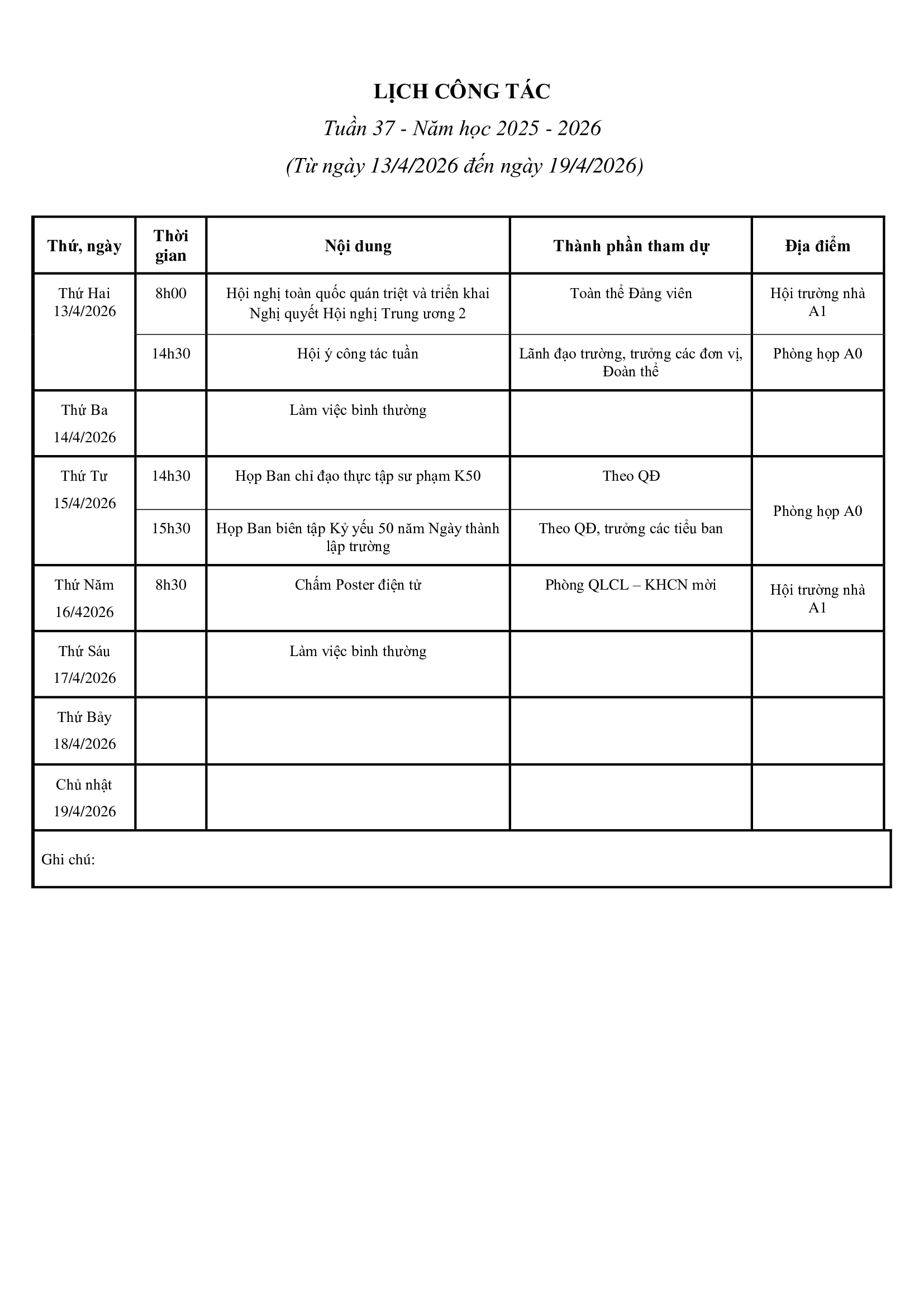 Lịch công tác tuần 37 (áp dụng từ ngày 13/4/2026 đến ngày 19/4/2026)
