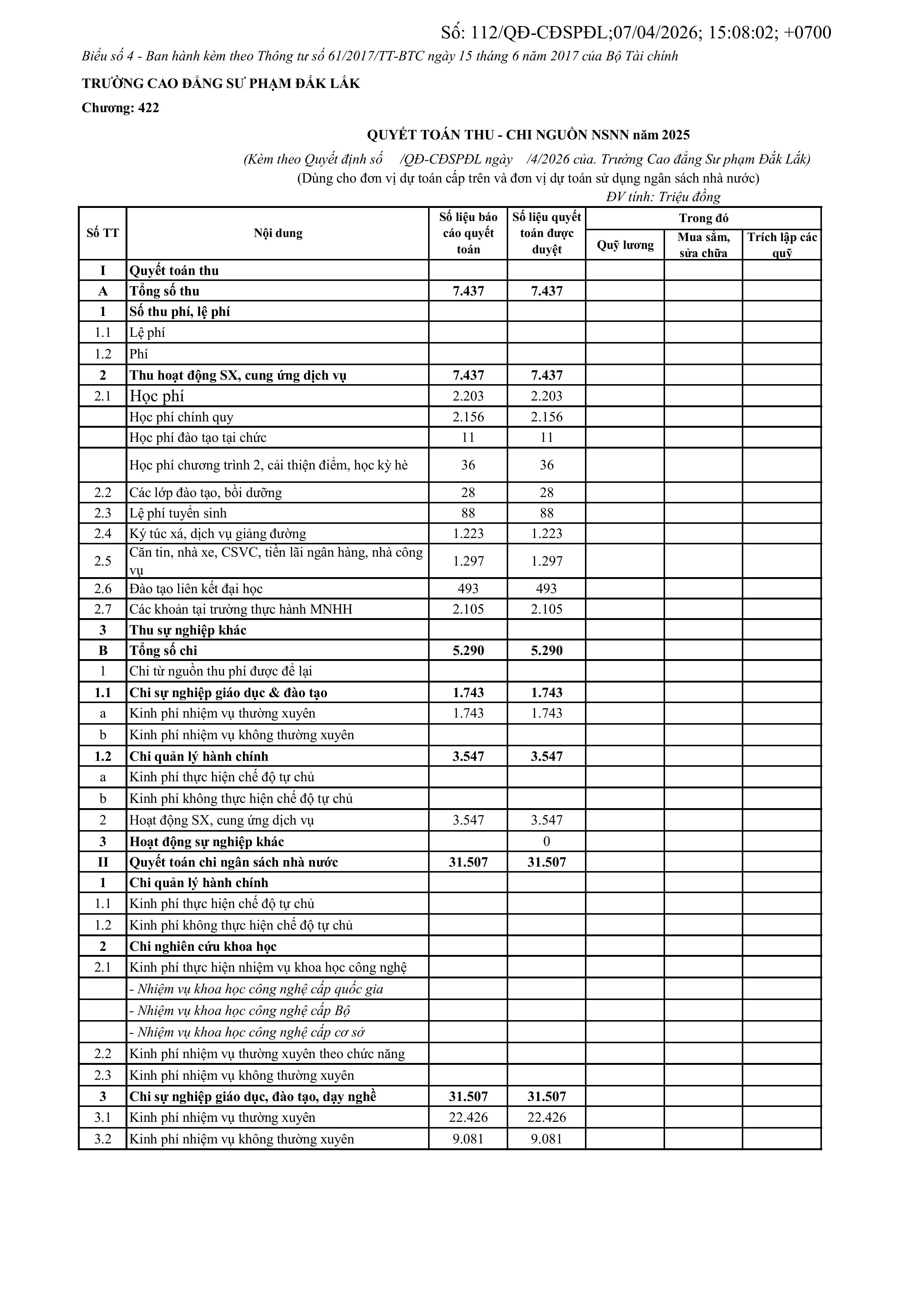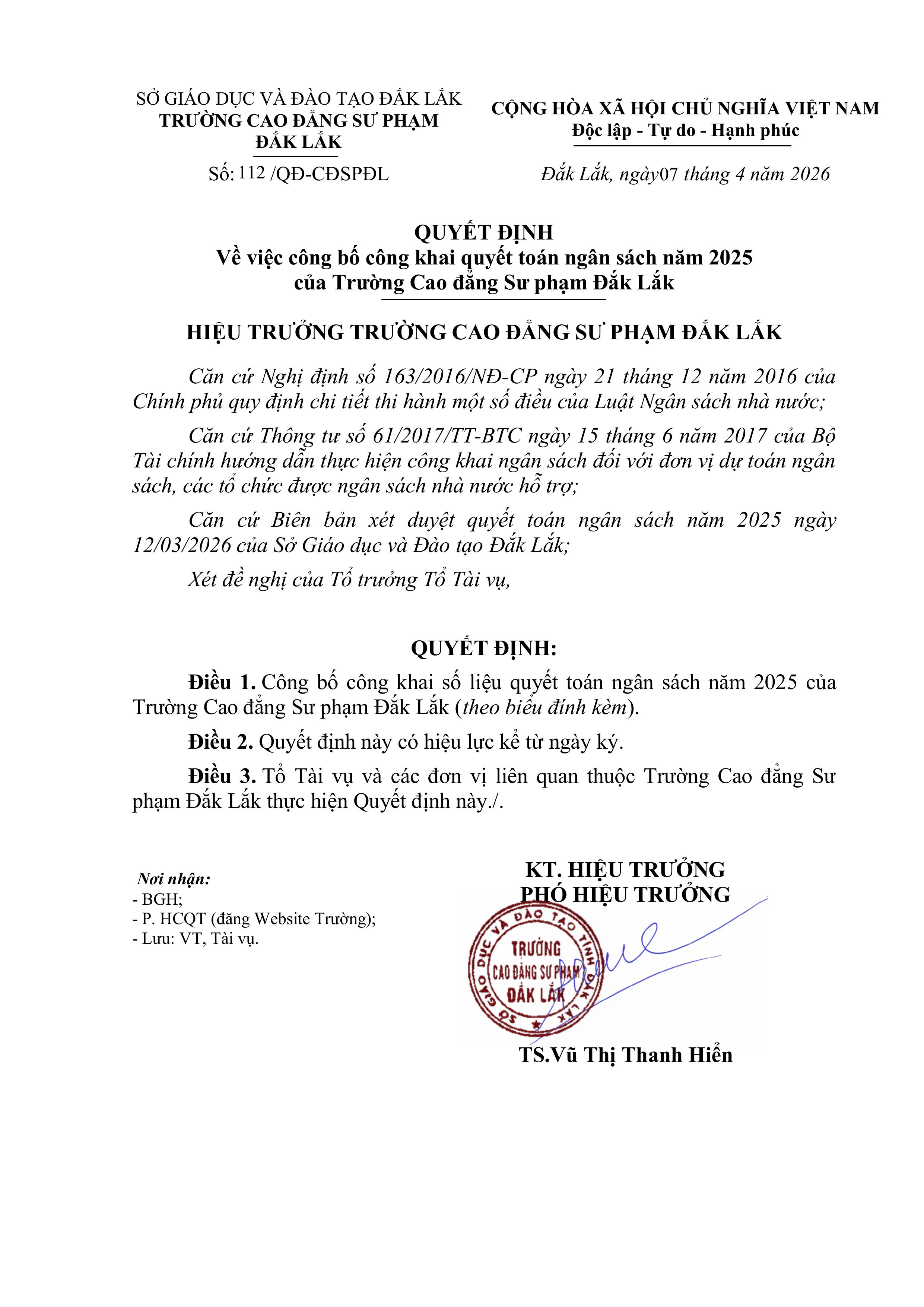 Quyết định về việc công bố công khai dự toán ngân sách năm 2025 của Trường Cao đẳng Sư phạm Đắk Lắk