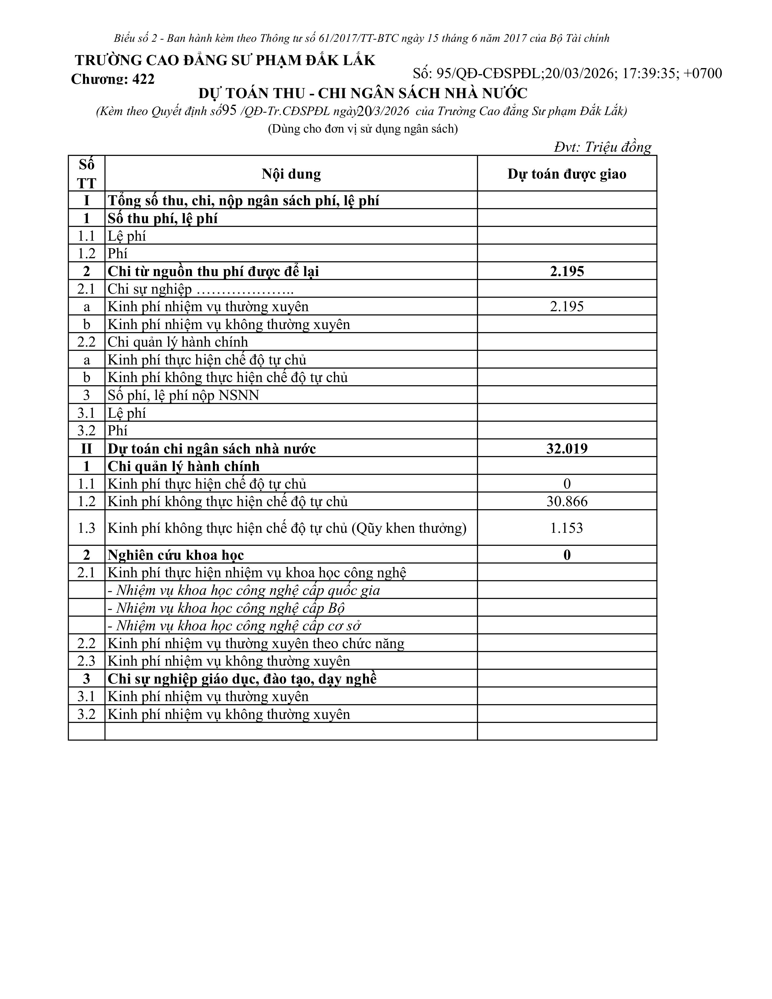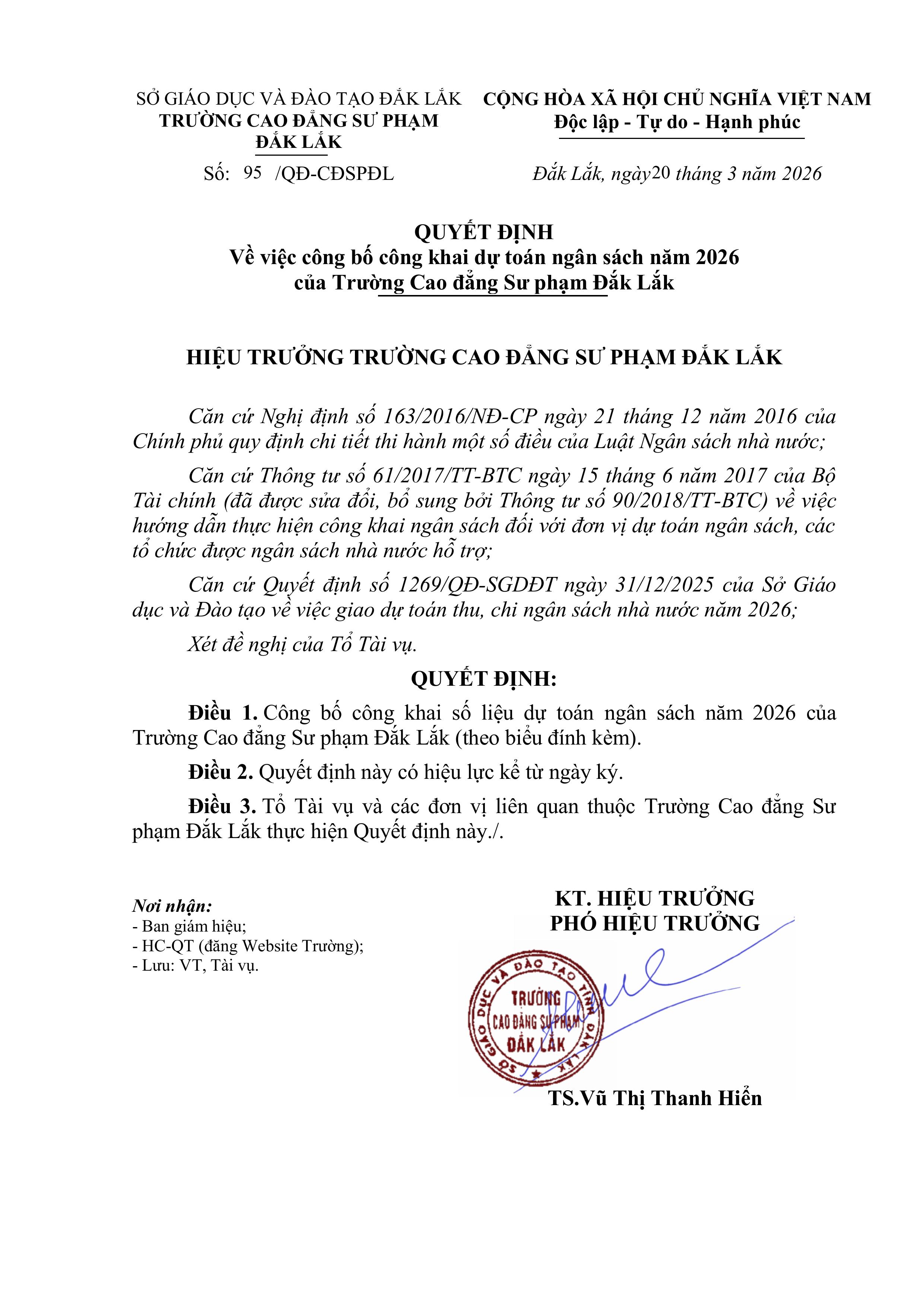 Quyết định về việc công bố công khai dự toán ngân sách năm 2026 của Trường Cao đẳng Sư phạm Đắk Lắk
