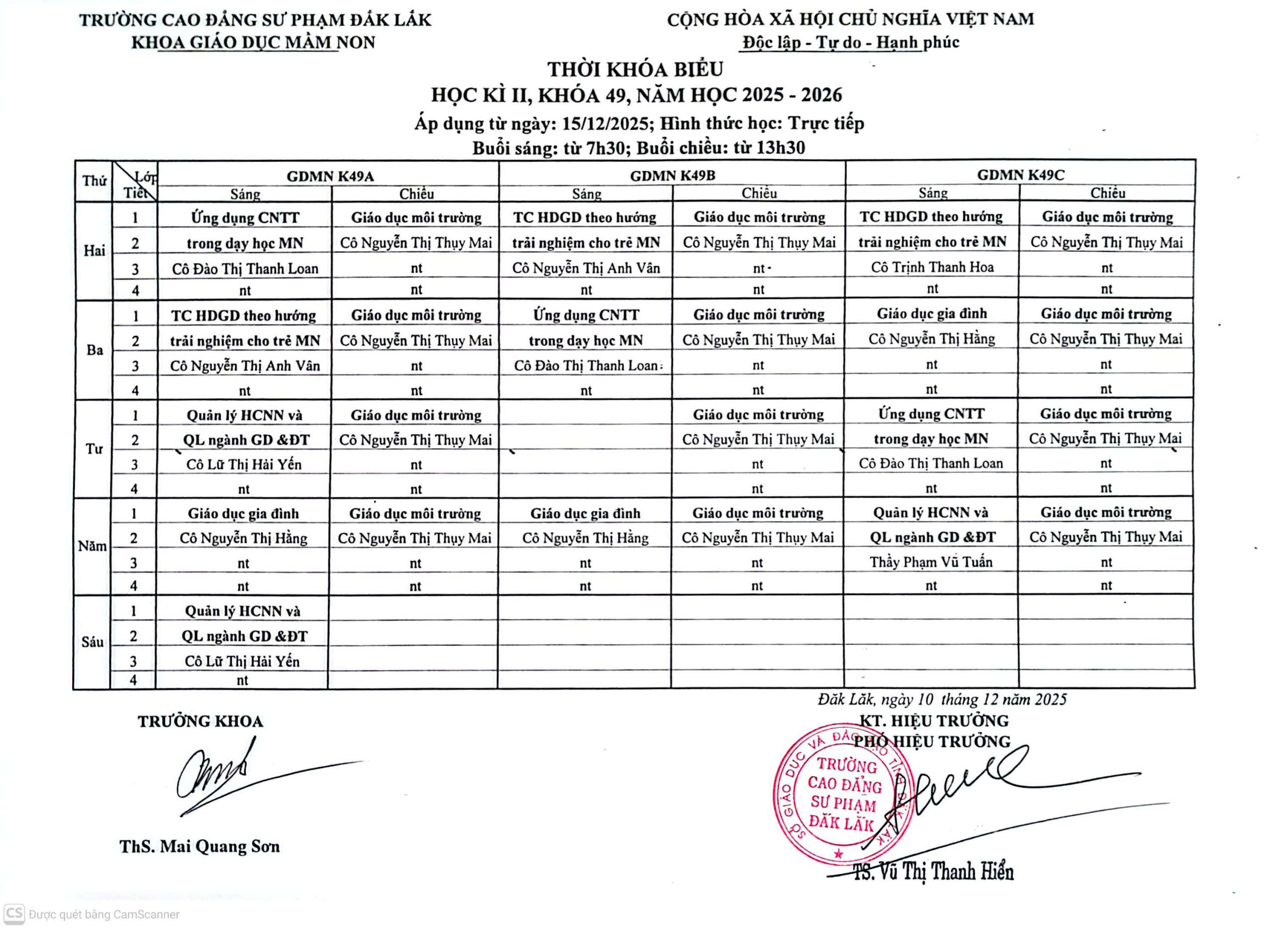 Thời khóa biểu học kỳ II, Khóa 49, năm học 2025 - 2026 (áp dụng từ ngày 15/12/2025)