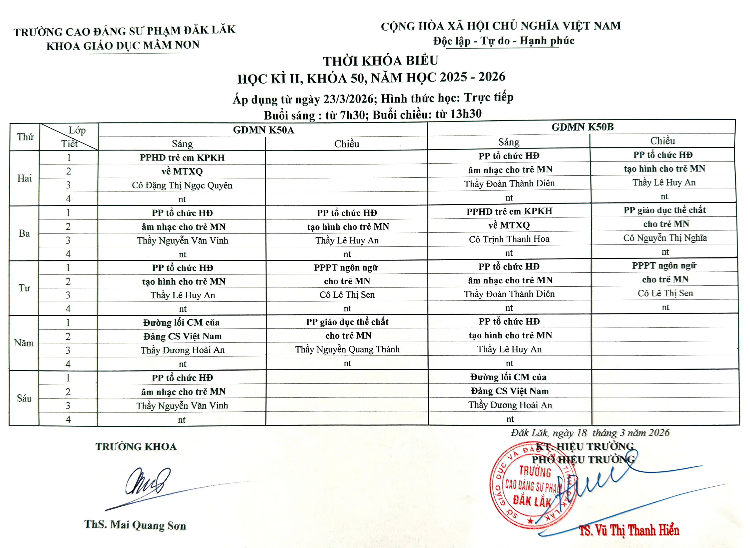 Thời khóa biểu học kỳ II, khóa 50 năm học 2025 - 2026 (áp dụng từ ngày 23/3/2026)