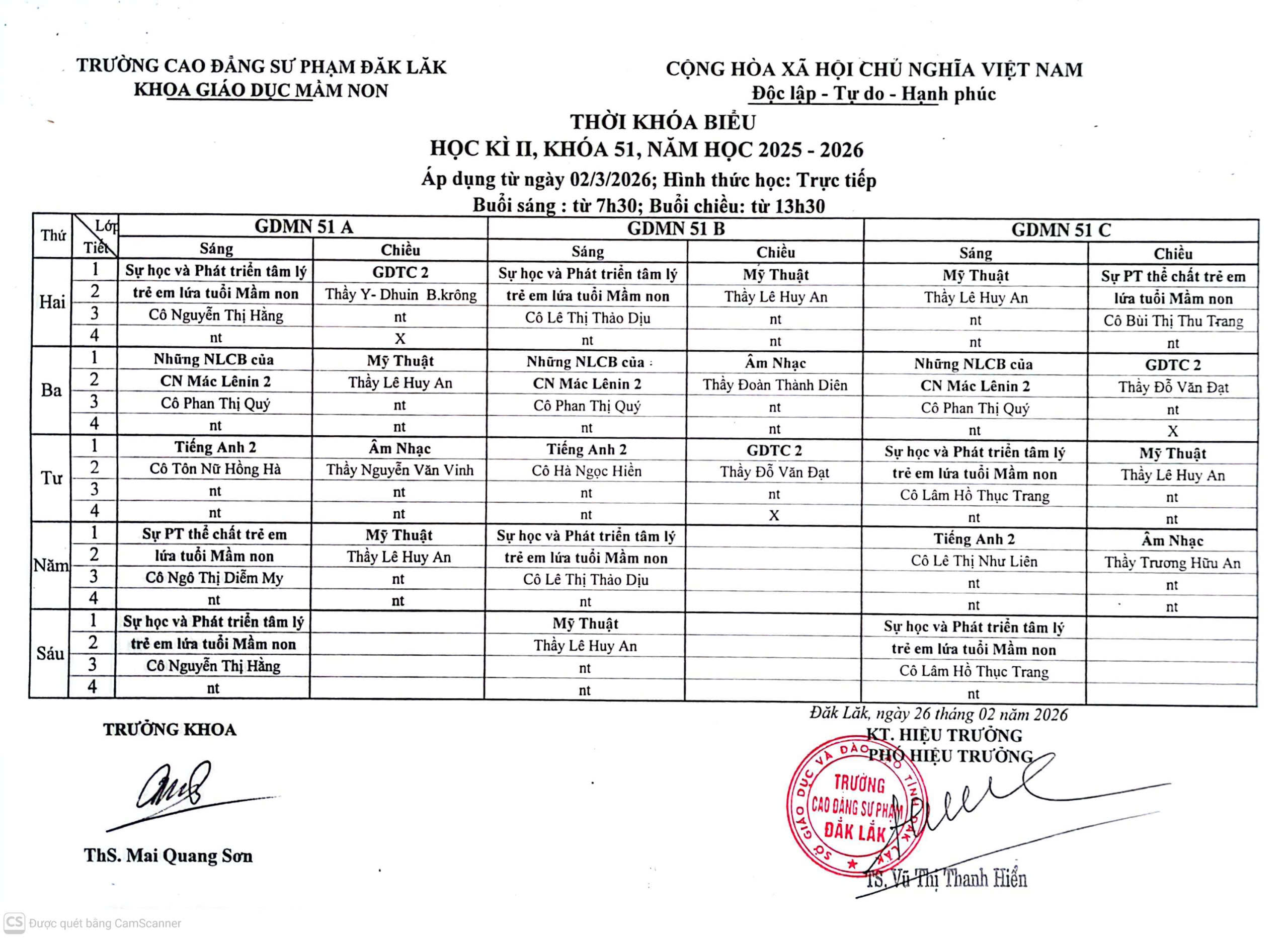 Thời khóa biểu, học kỳ II, khóa 51, năm học 2025 - 2026 (áp dụng từ ngày 02/3/2026)