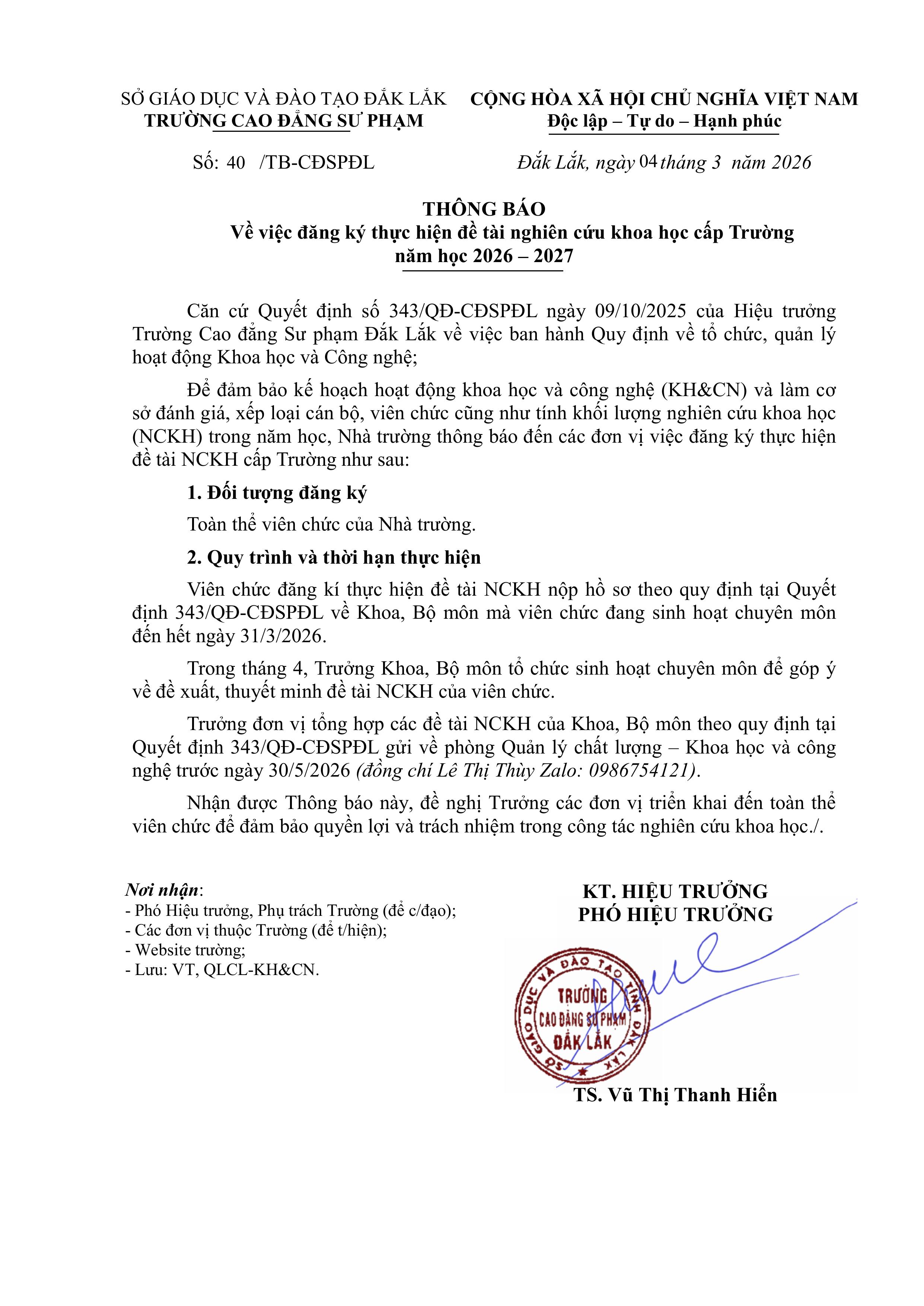 Thông báo về việc đăng ký thực hiện đề tài nghiên cứu khoa học cấp Trường năm học 2026 – 2027
