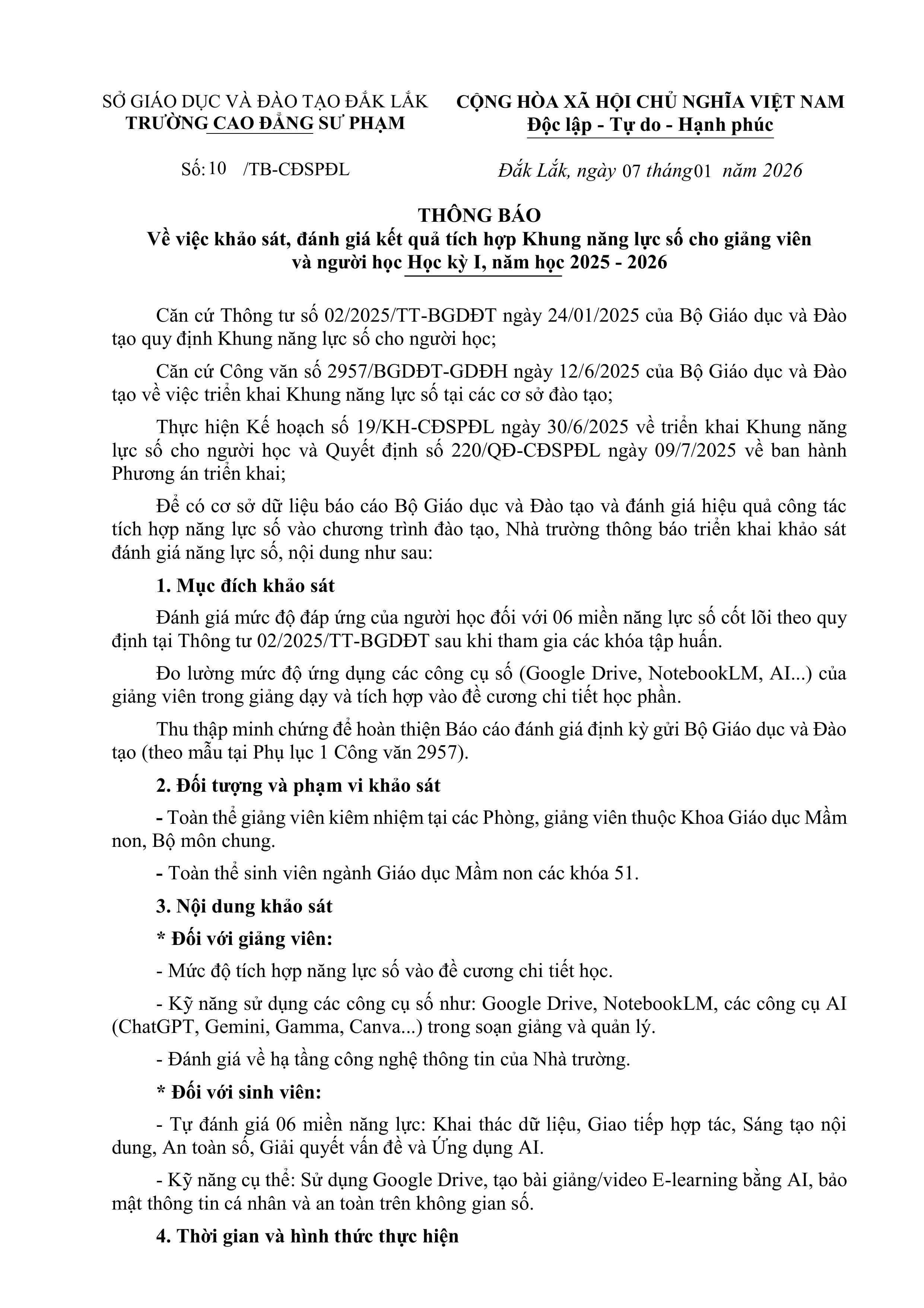 Thông báo về việc khảo sát, đánh giá kết quả tích hợp Khung năng lực số giảng viên và người học học kỳ I , năm học 2025 - 2026