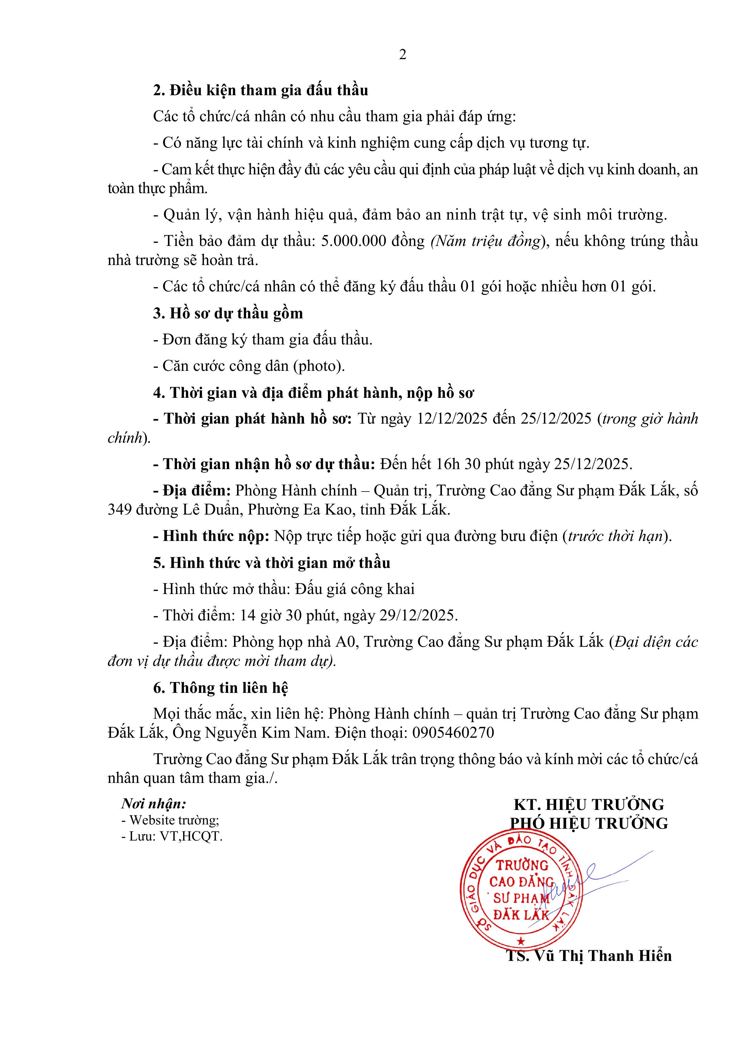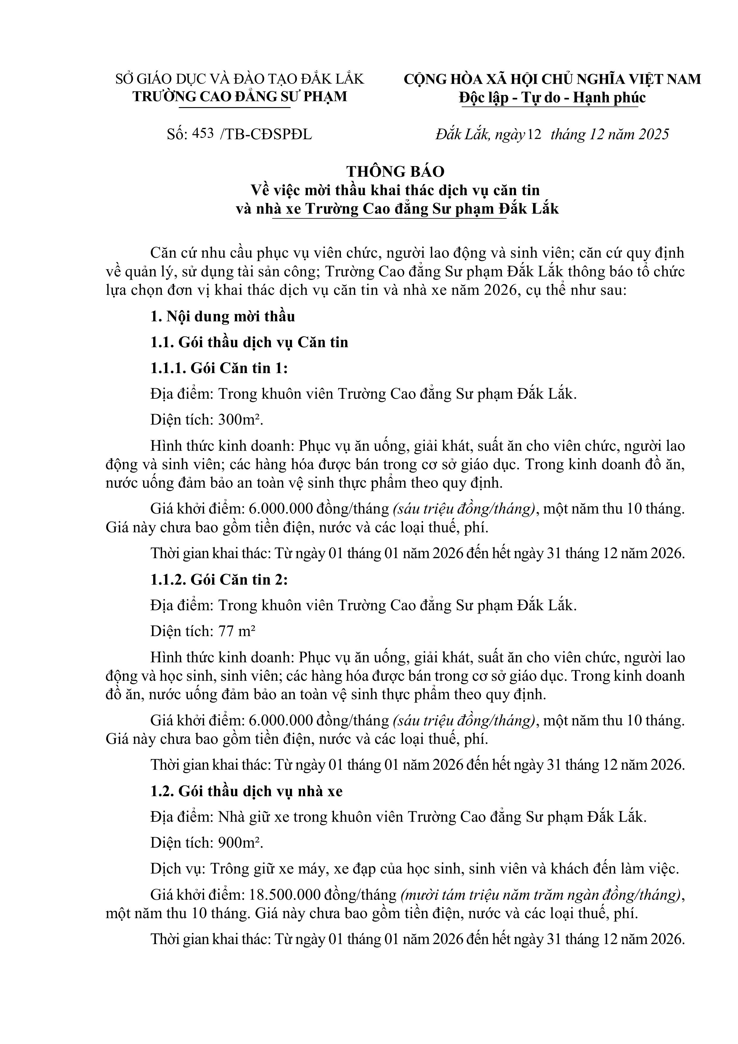 Thông báo về việc mời thầu khai thác dịch vụ căn tin và nhà xe trường Cao đẳng Sư phạm Đắk Lắk