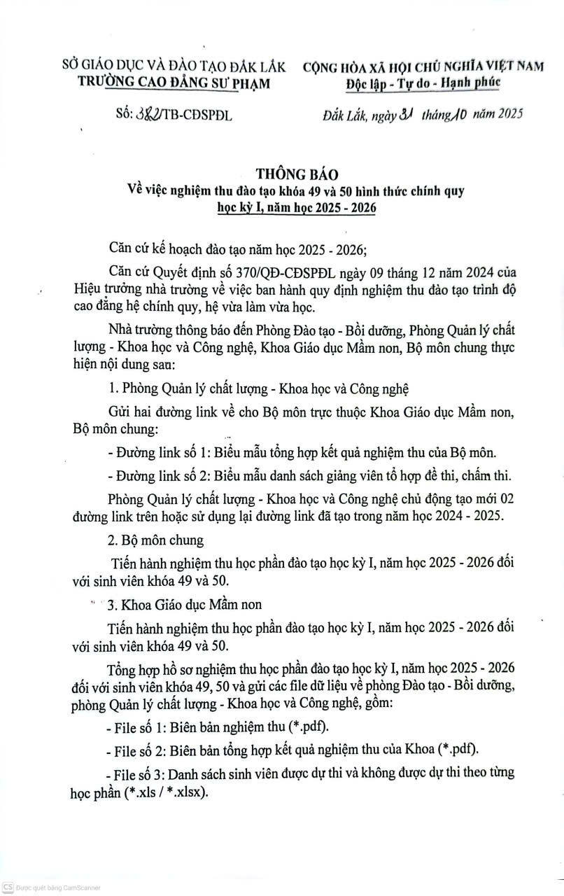 Thông báo về việc báo cáo kết quả thực hiện Kế hoạch số 27/KH-CĐSPĐL ngày 28/8/2025 của trường Cao đẳng Sư phạm Đắk Lắk