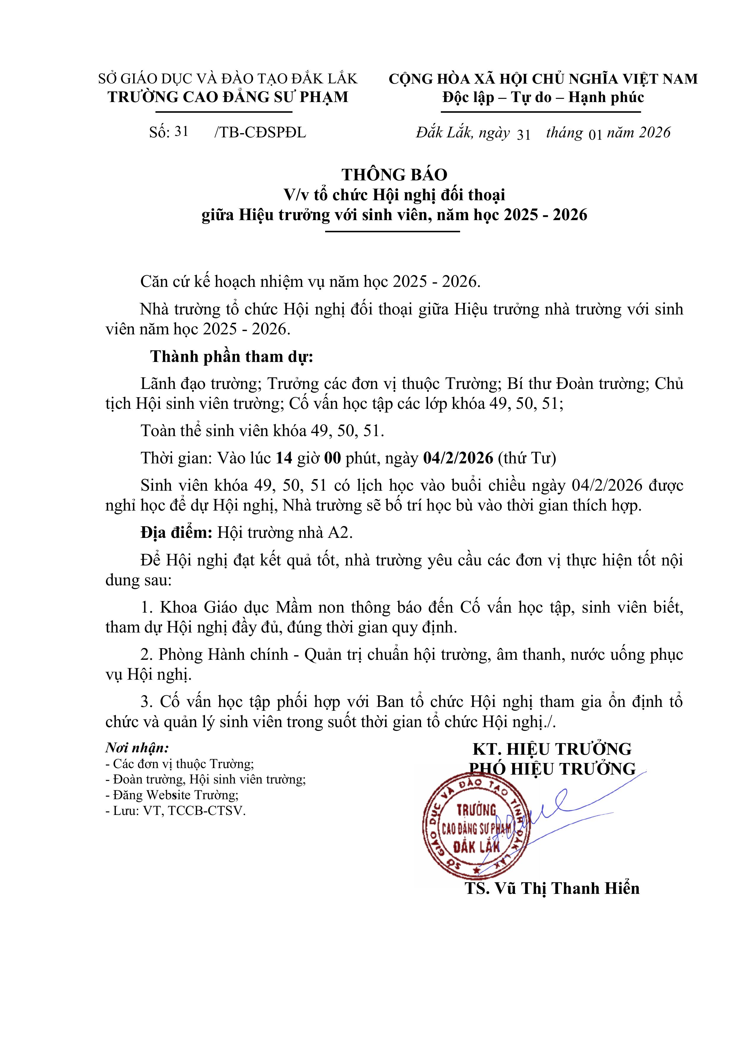 Trường Cao đẳng Sư phạm Đắk Lắk thông báo về việc chuẩn bị nội dung đối thoại giữa Hiệu trưởng với sinh viên