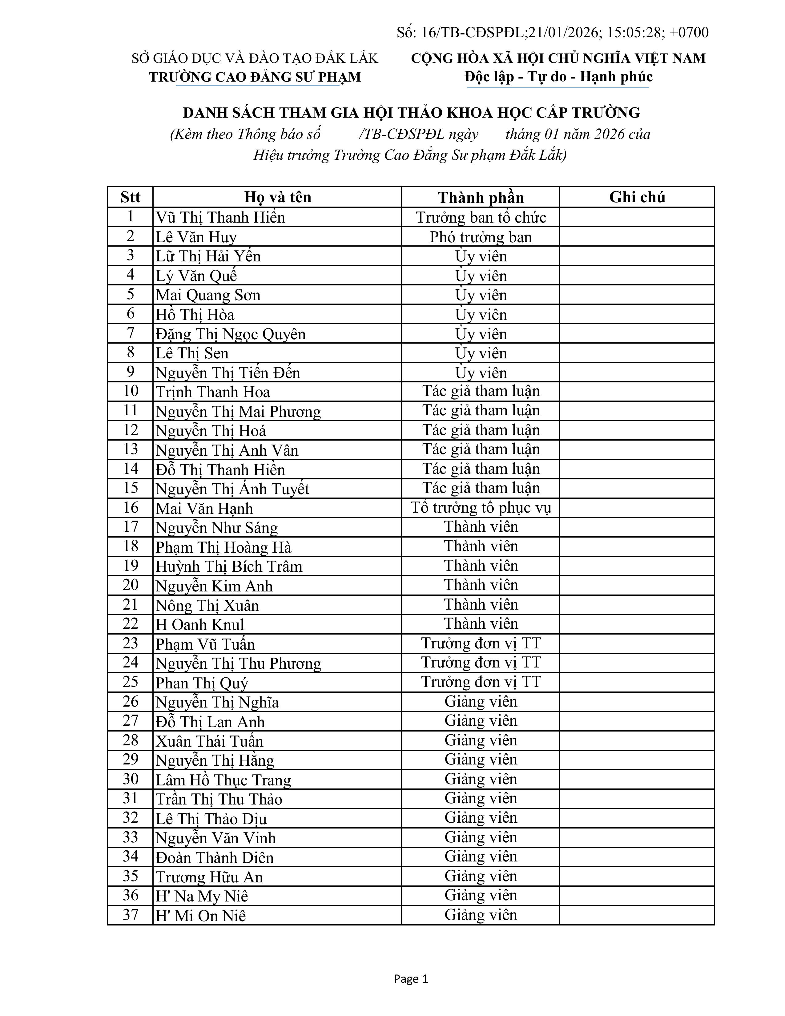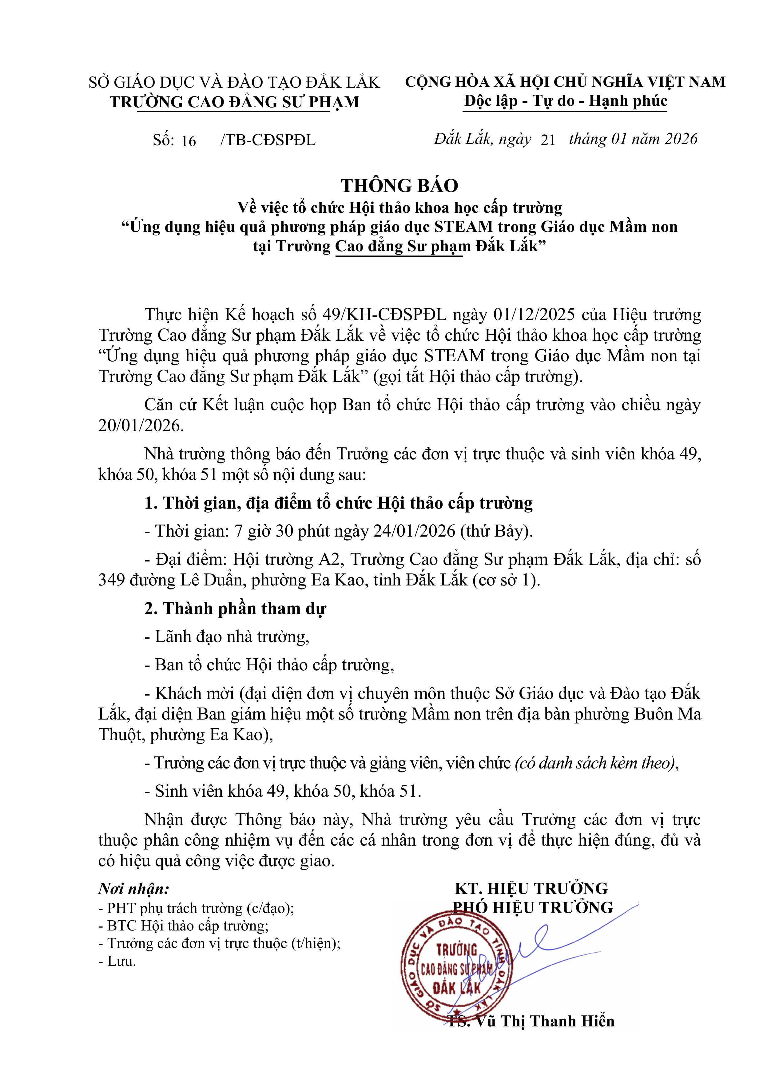 Thông báo về việc tổ chức Hội thảo khoa học cấp trường ứng dụng hiệu quả phương pháp Giáo dục STEAM trong Giáo dục Mầm non tại trường Cao đẳng Sư phạm Đắk Lắk