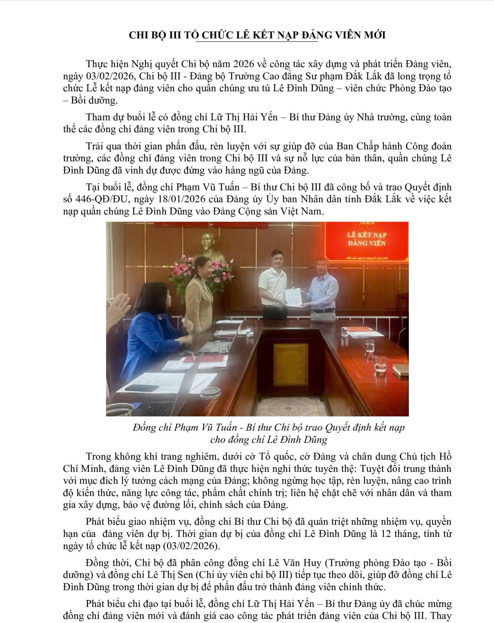 Chi bộ III tổ chức Lễ kết nạp Đảng viên mới