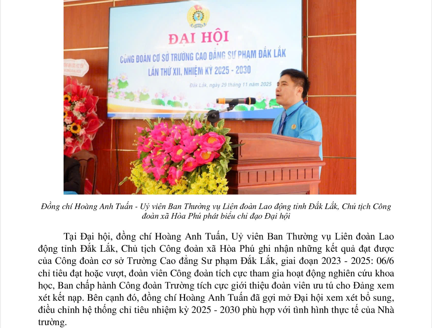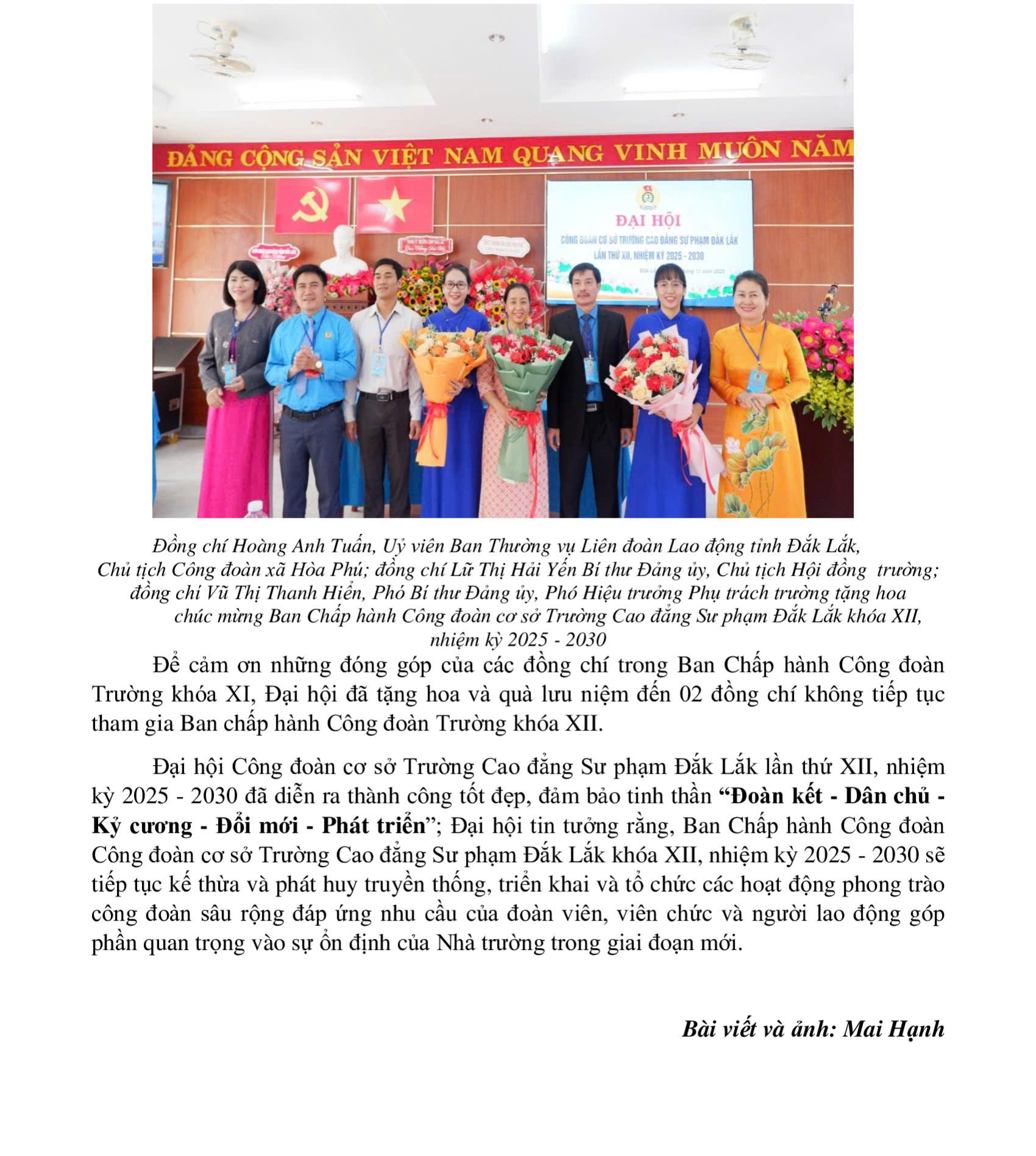 Đại hội Công đoàn cơ sở Trường Cao đẳng Sư phạm Đắk Lắk lần thứ XII, nhiệm kỳ 2025 - 2030
