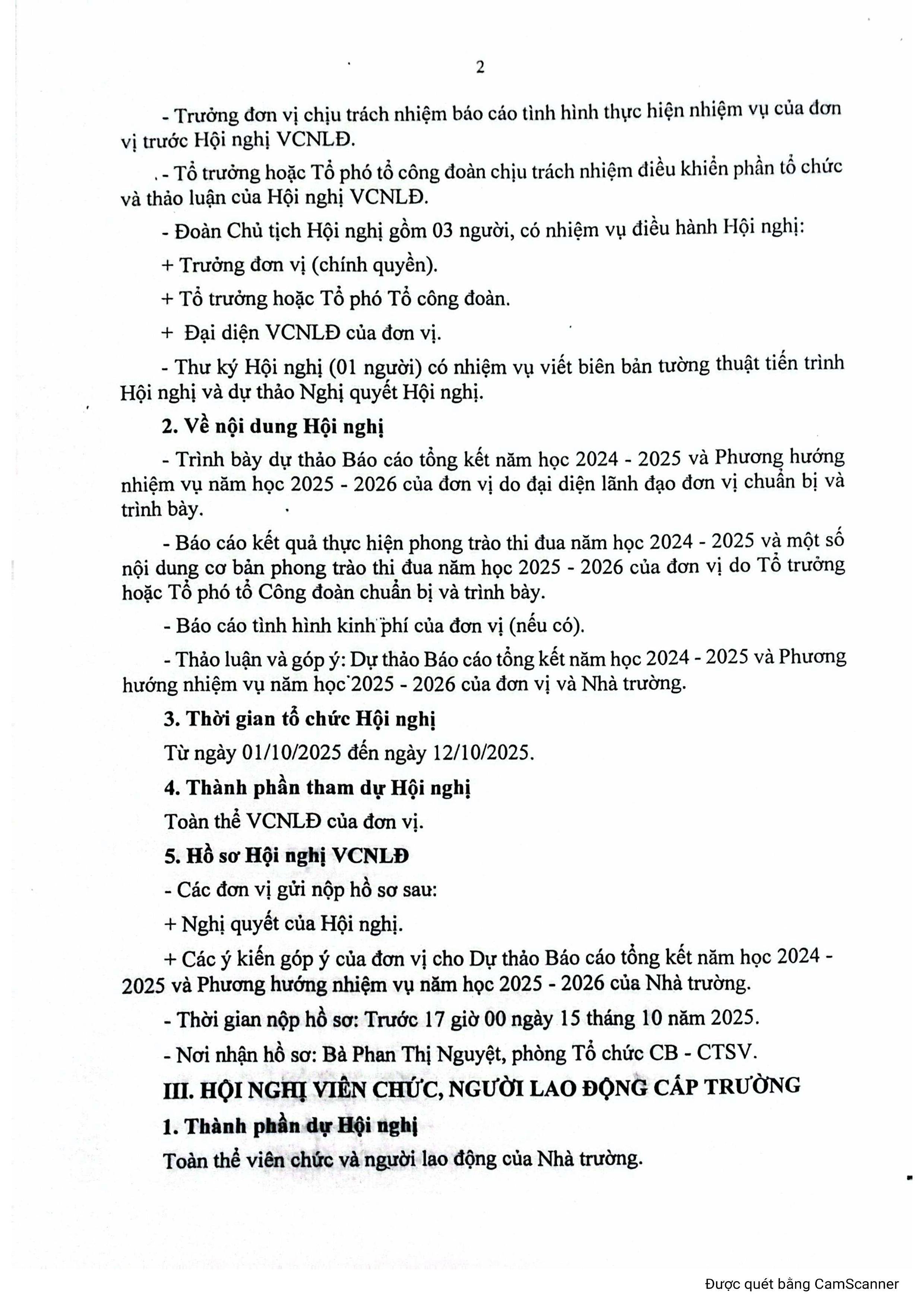 Hướng dẫn về việc tổ chức Hội nghị viên chức, người lao động cấp bộ phận và Hội nghị viên chức, người lao động cấp trường năm học 2025 - 2026