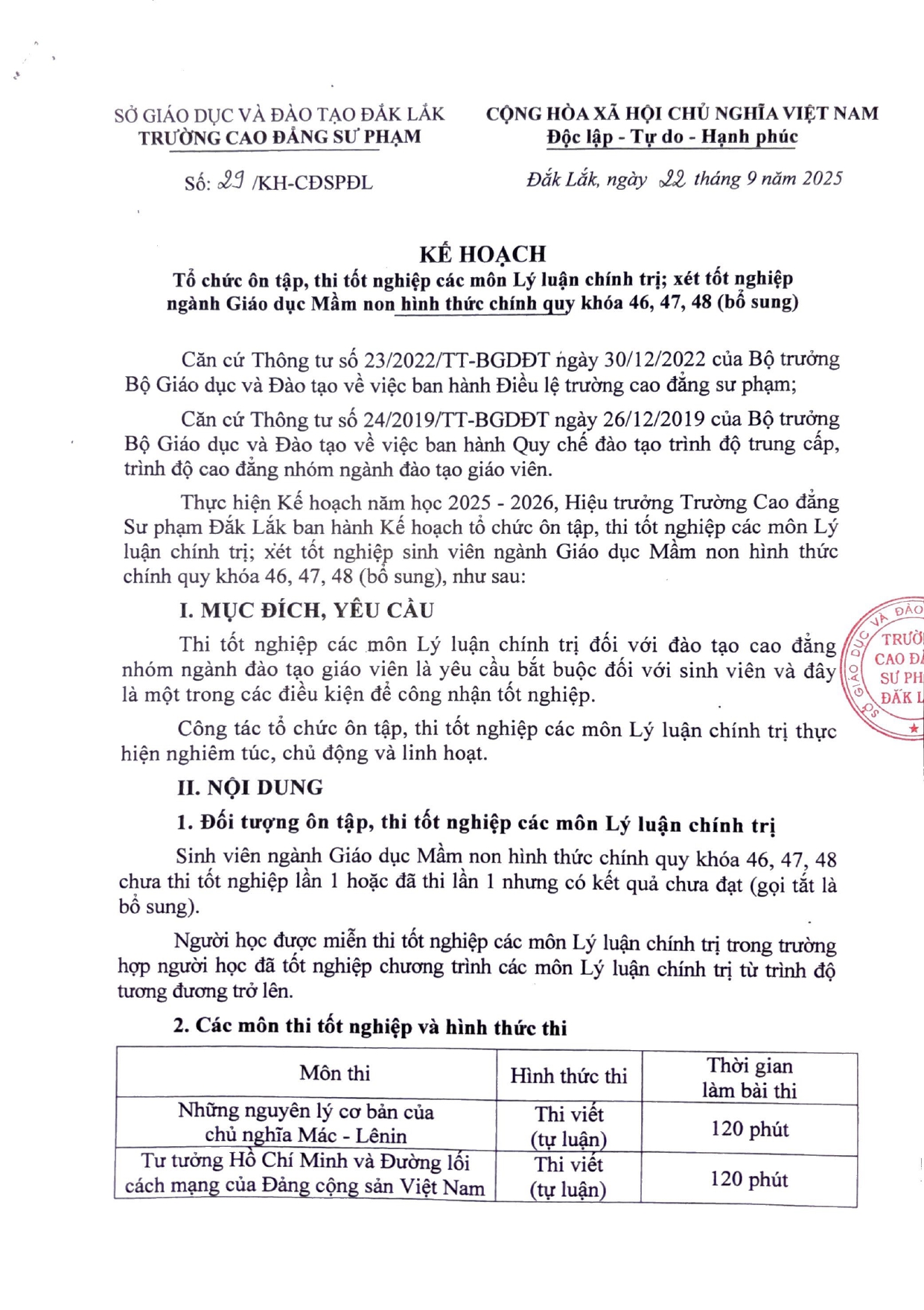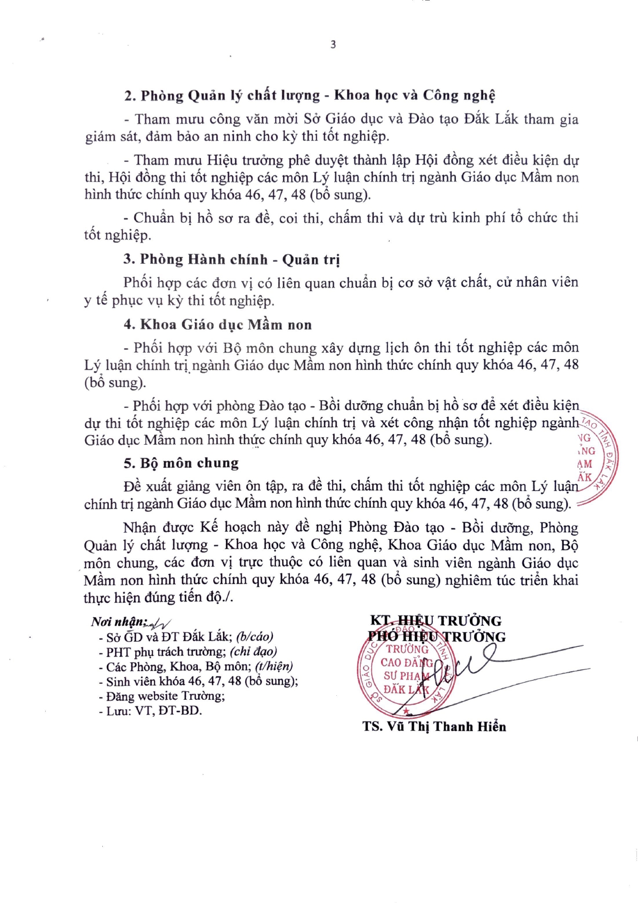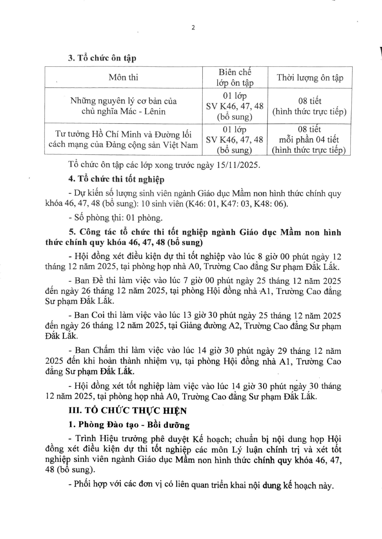 Kế hoạch tổ chức ôn tập, thi tốt nghiệp các môn Lý luận chính trị; xét tốt nghiệp ngành Giáo dục Mầm non hình thức chính quy 46, 47 và 48