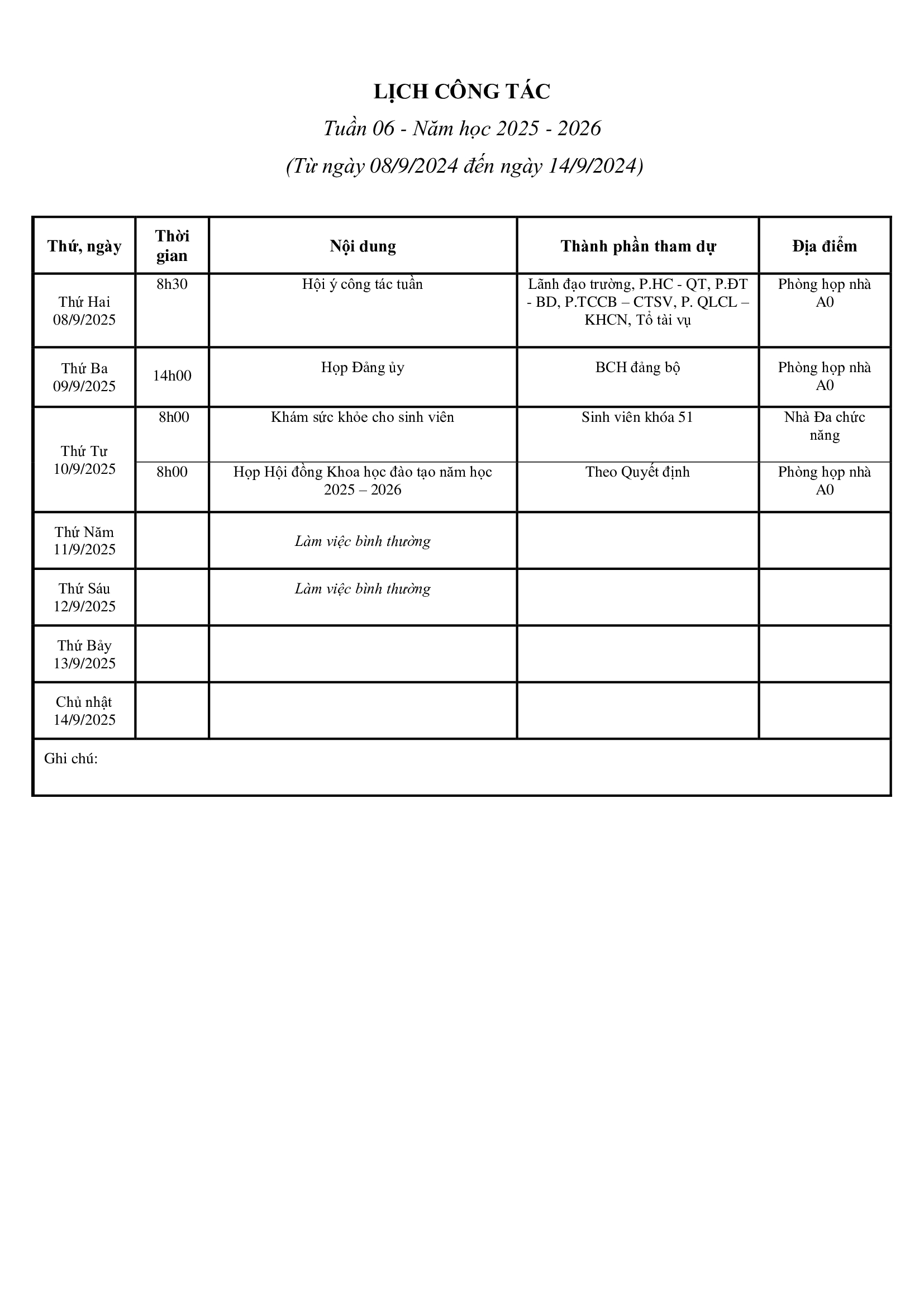 Lịch công tác tuần 06 (áp dụng từ ngày 08/9/2025 đến ngày 14/9/2025)