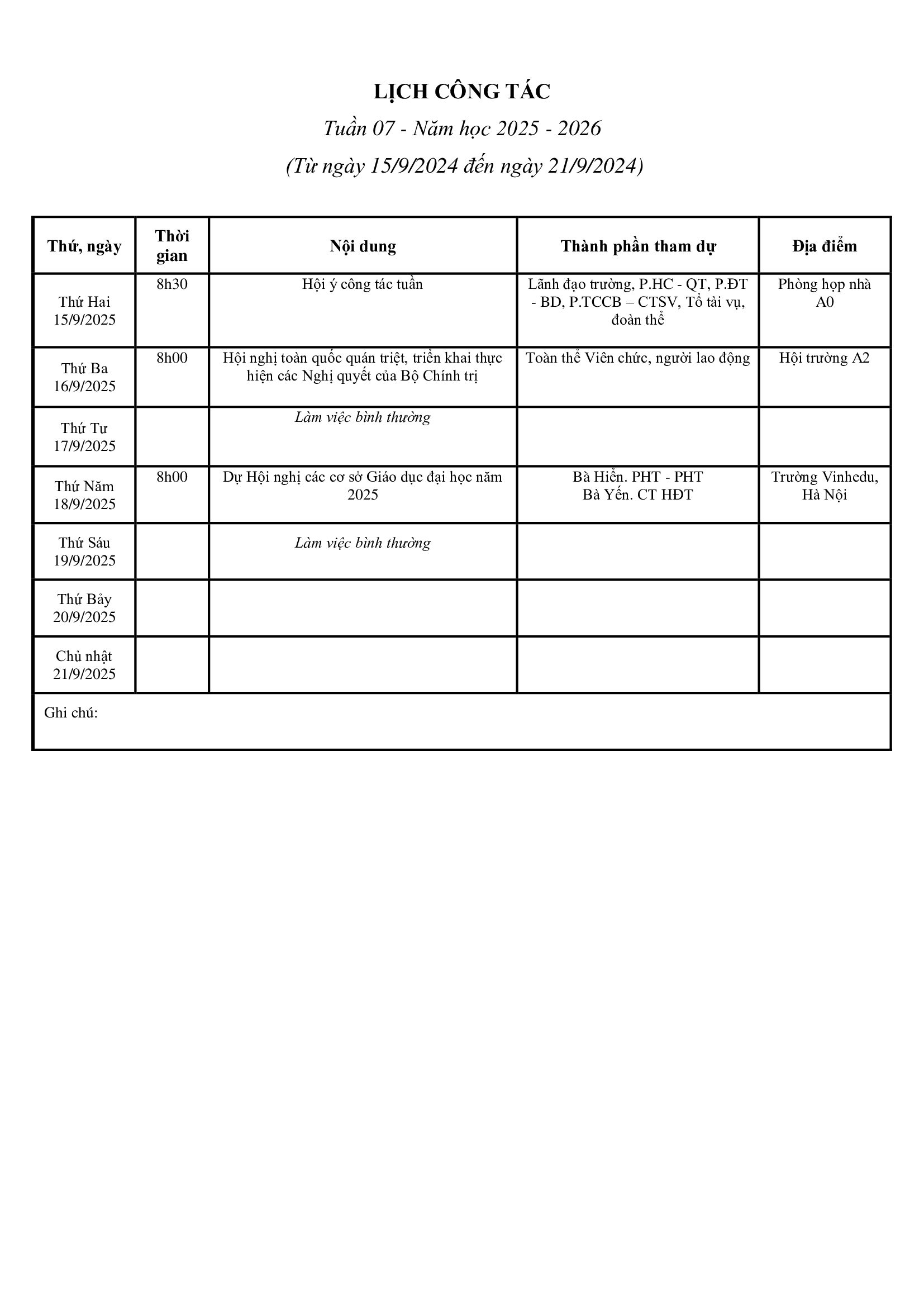 Lịch công tác tuần 07 (áp dụng từ ngày 15/9/2025 đến ngày 21/9/2025)