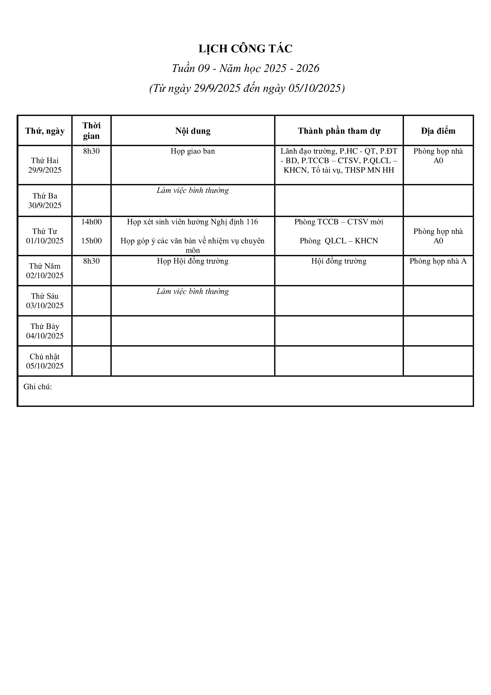 Lịch công tác tuần 09 (áp dụng từ ngày 29/9/2025 đến ngày 05/10/2025)