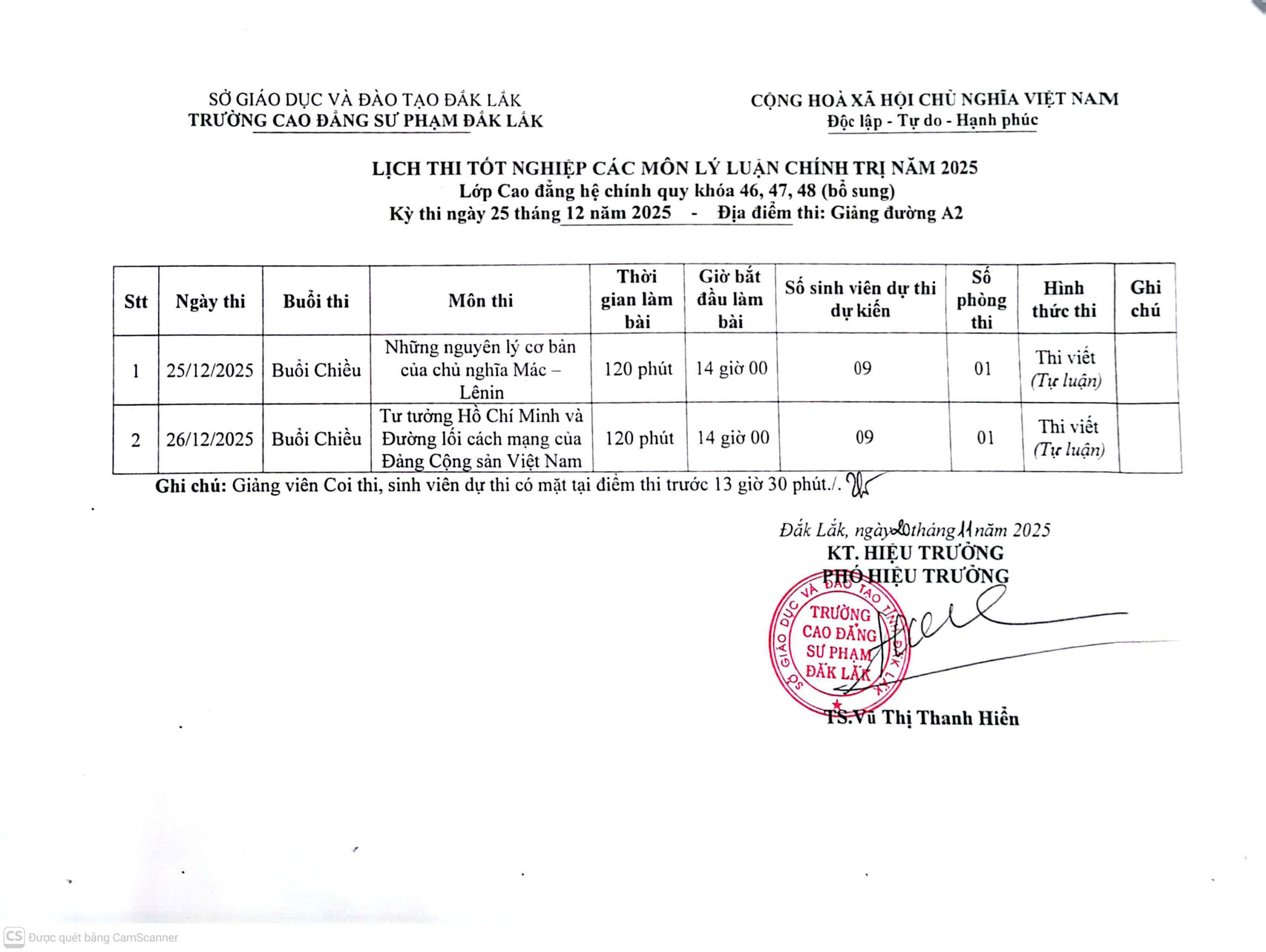 Lich thi tốt nghiệp các môn lý luận chính trị năm 2025, lớp Cao đẳng hệ chính quy khóa 46, 47, 48 kỳ thi ngày 25 tháng 12 năm 2025
