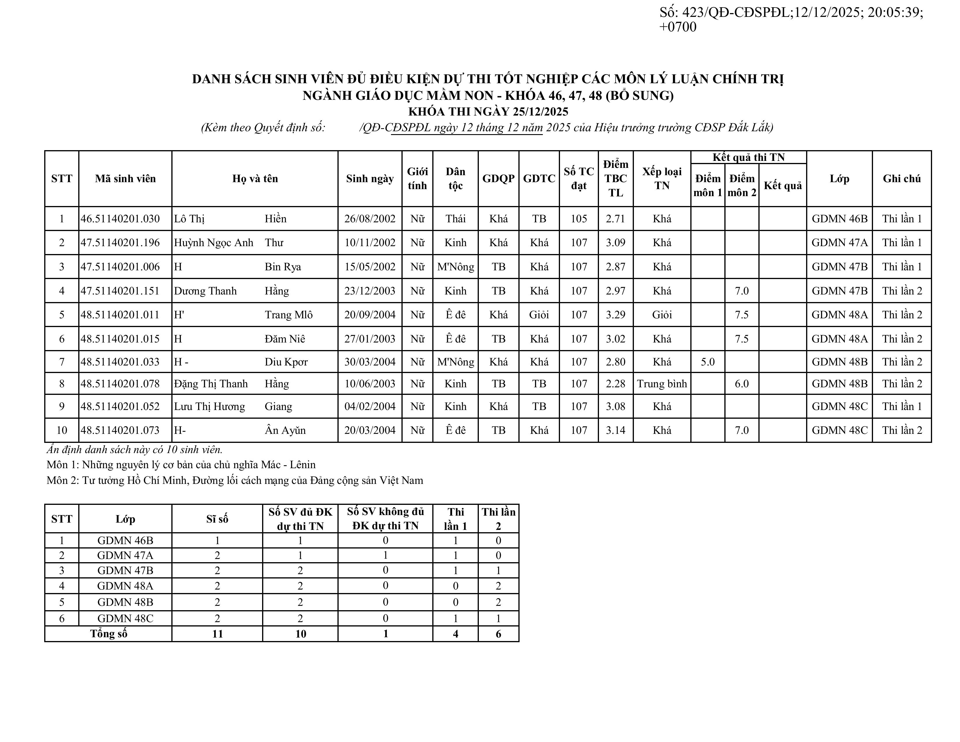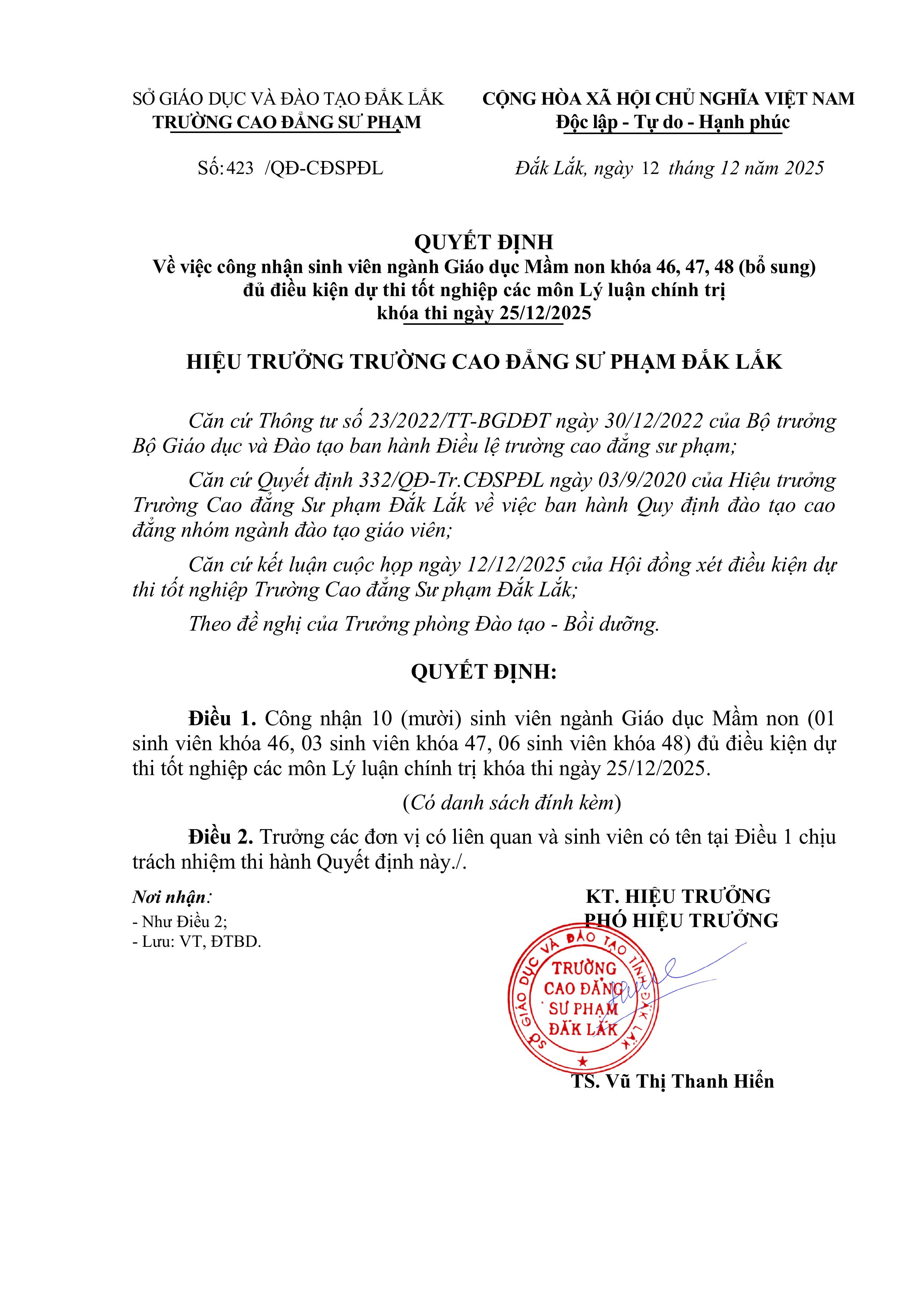 Quyết định về việc công nhận sinh viên ngành Giáo dục Mầm non khóa 46, 47, 48 đủ điều kiện dự thi tốt nghiệp các môn Lý luận chính trị khóa thi ngày 25/12/2025