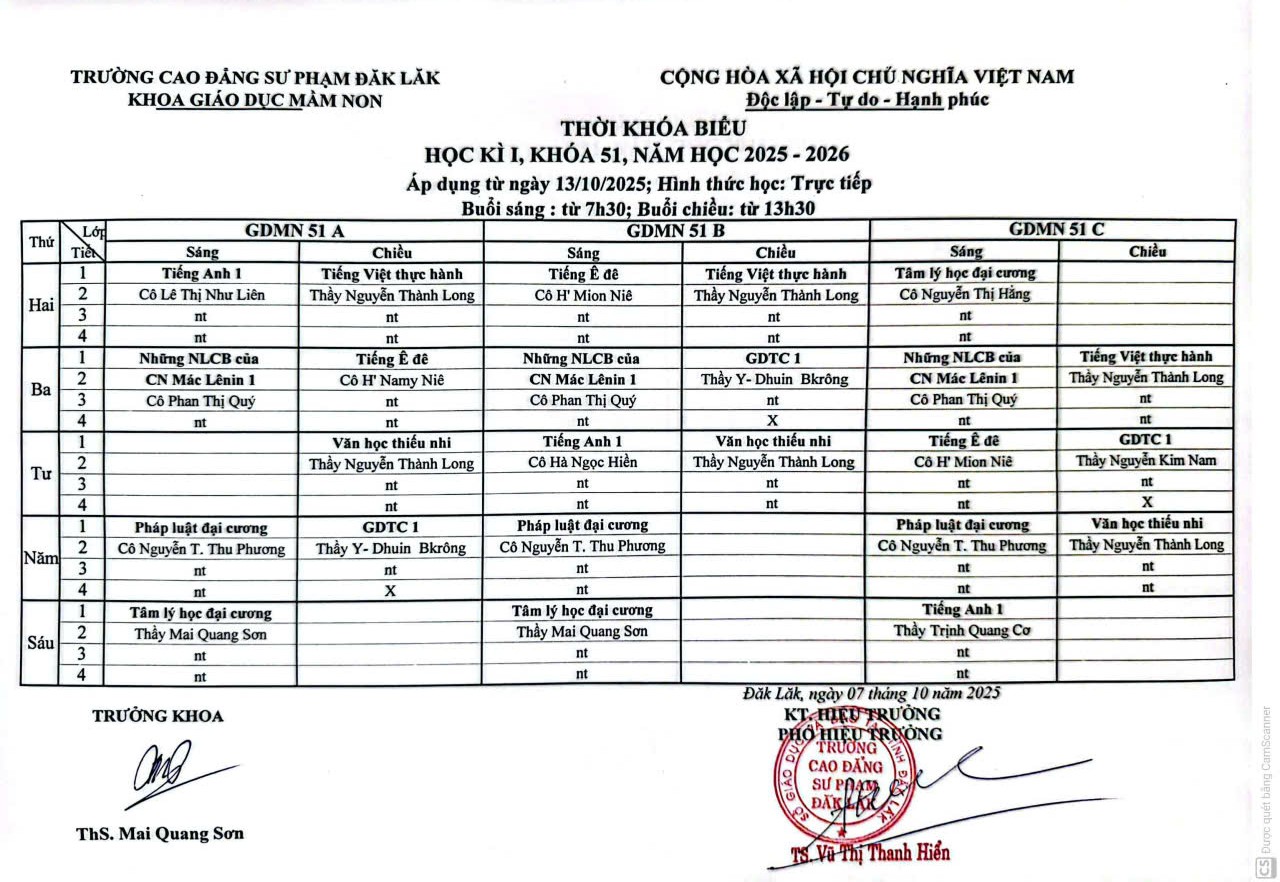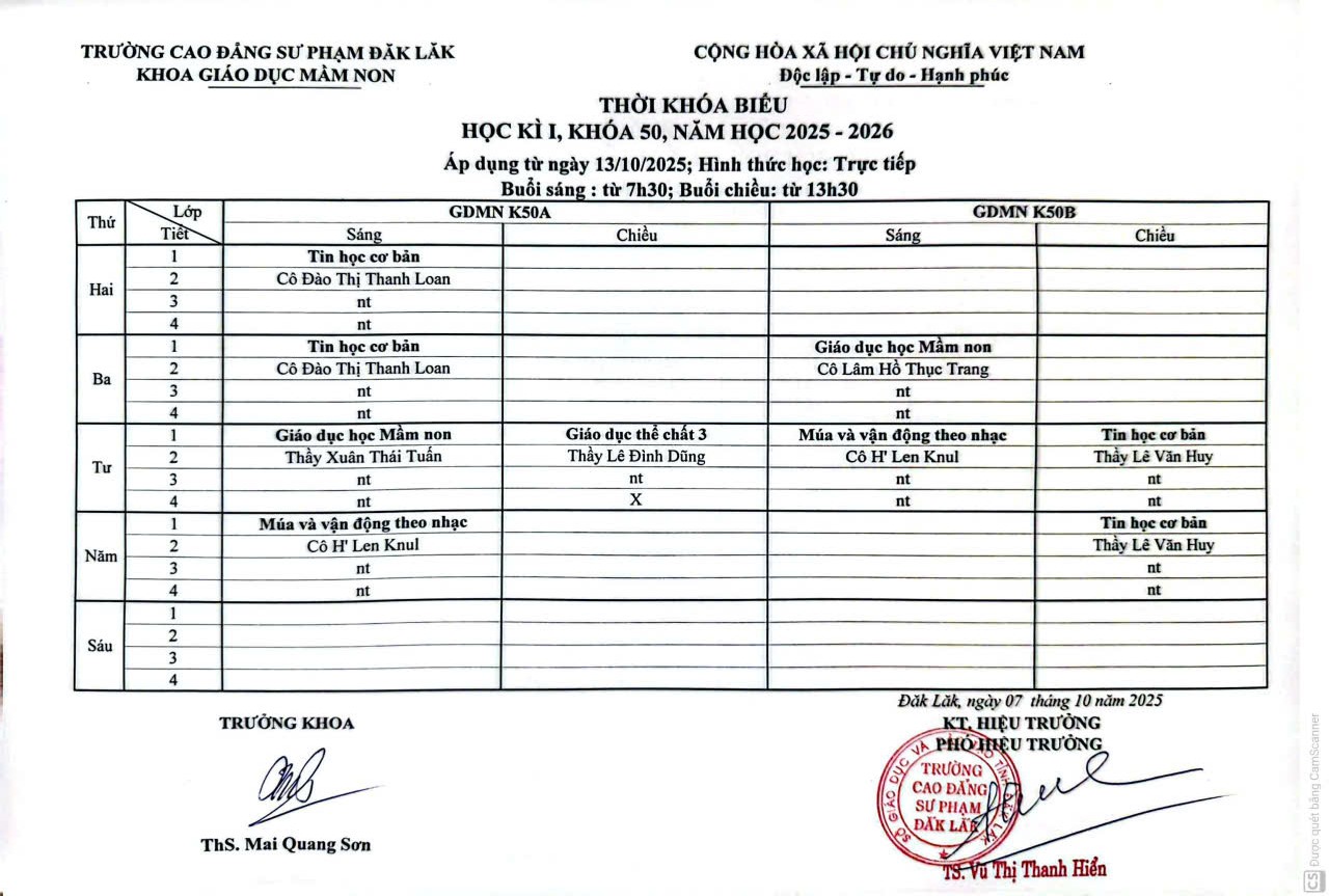 Thời khóa biểu học kỳ I, khóa 50 và 51, năm học 2025 - 2026 (áp dụng từ ngày 13/10/2025)