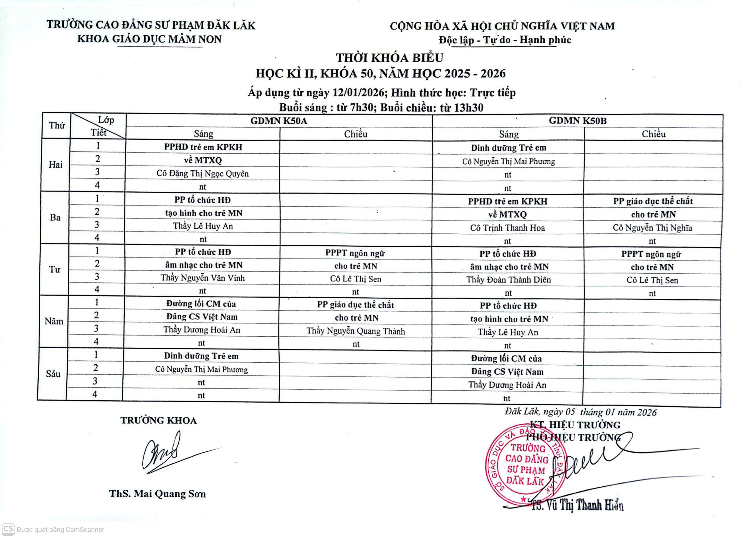 Thời khóa biểu học kỳ II, khóa 50 năm học 2025 - 2026 (Áp dụng từ ngày 12/01/2026)